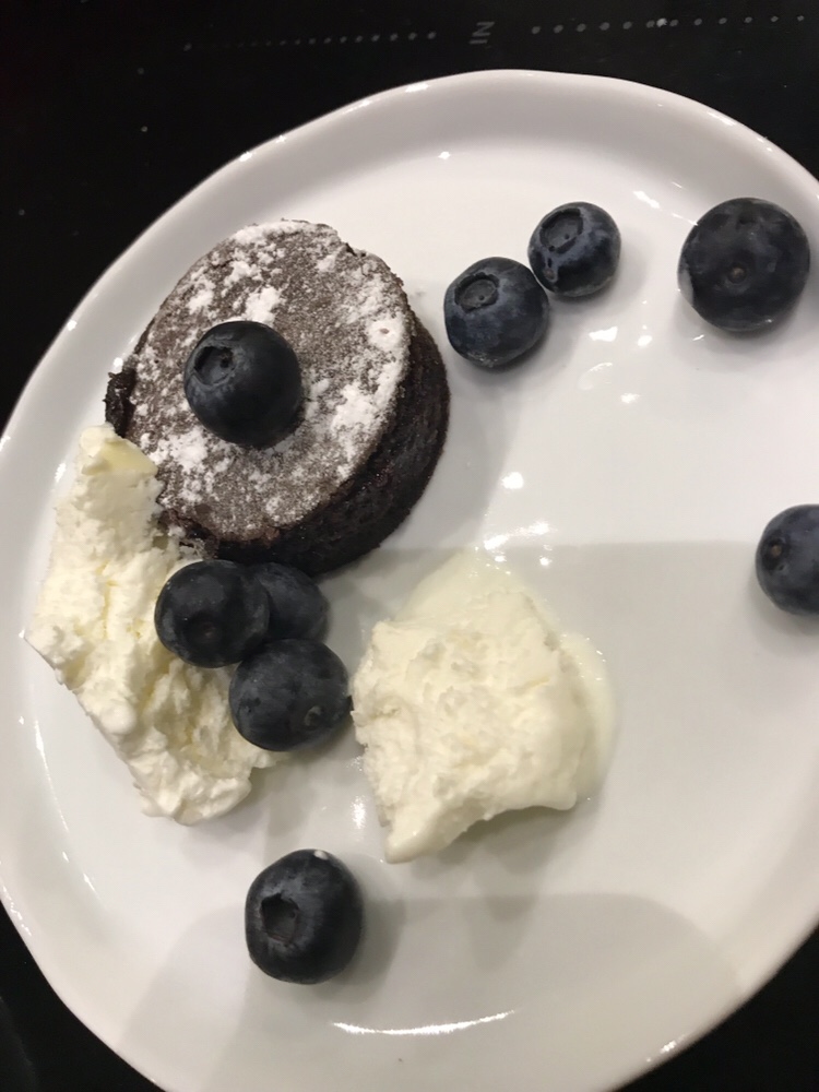Till dessert kladdkaka med glass och blåbär