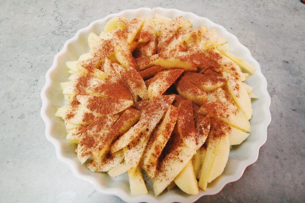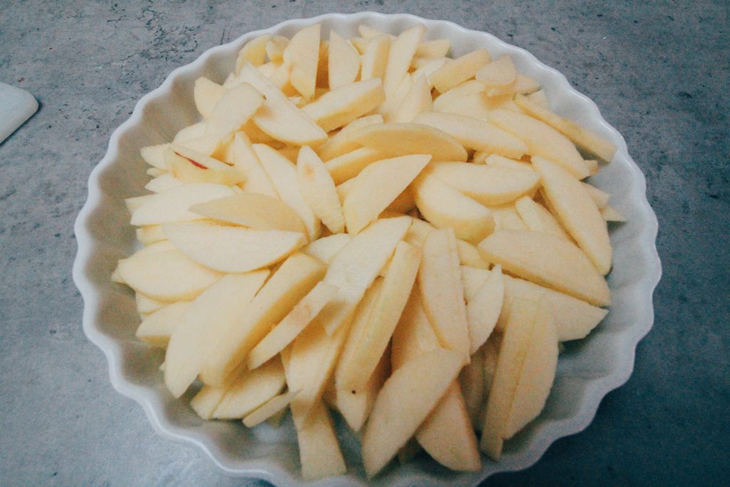 Skalade och skivade äpplen och la i en pajform