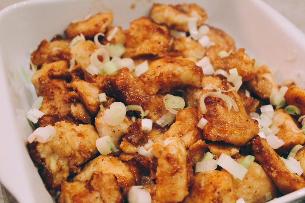 Häll potatismjöl, salt och peppar i en fryspåse. Skaka runt kycklingbitarna i påsen så att de täcks helt med potatismjölet.