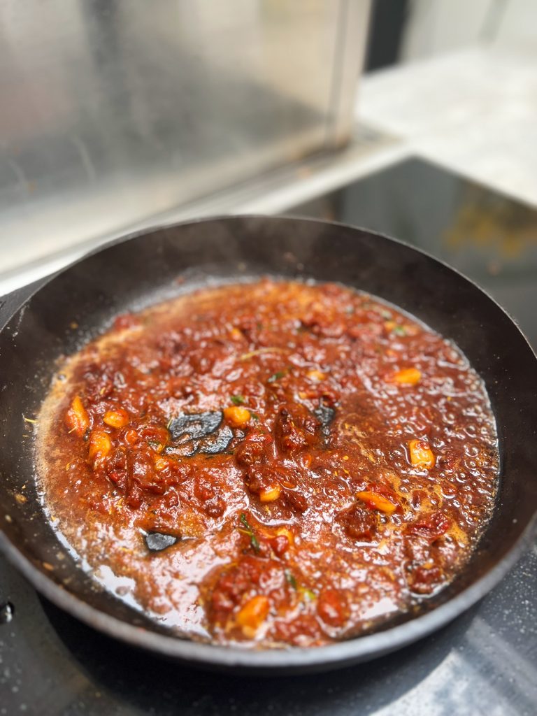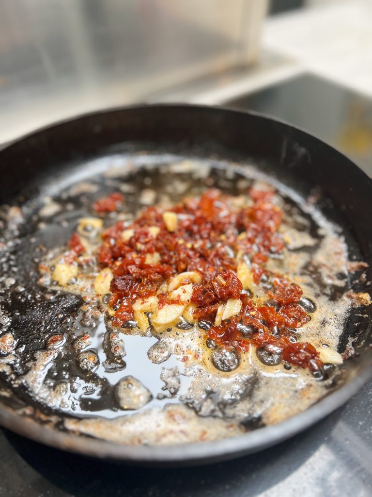 Såsen kokas ihop på strimlade soltorkade tomater, tomatpure och vitlök som får steka ihop några minuter på medelvärme. Tillsätt sedan vitt vin och torkad oregano. Häll på kycklingfond och vatten och låt allt koka ihop.