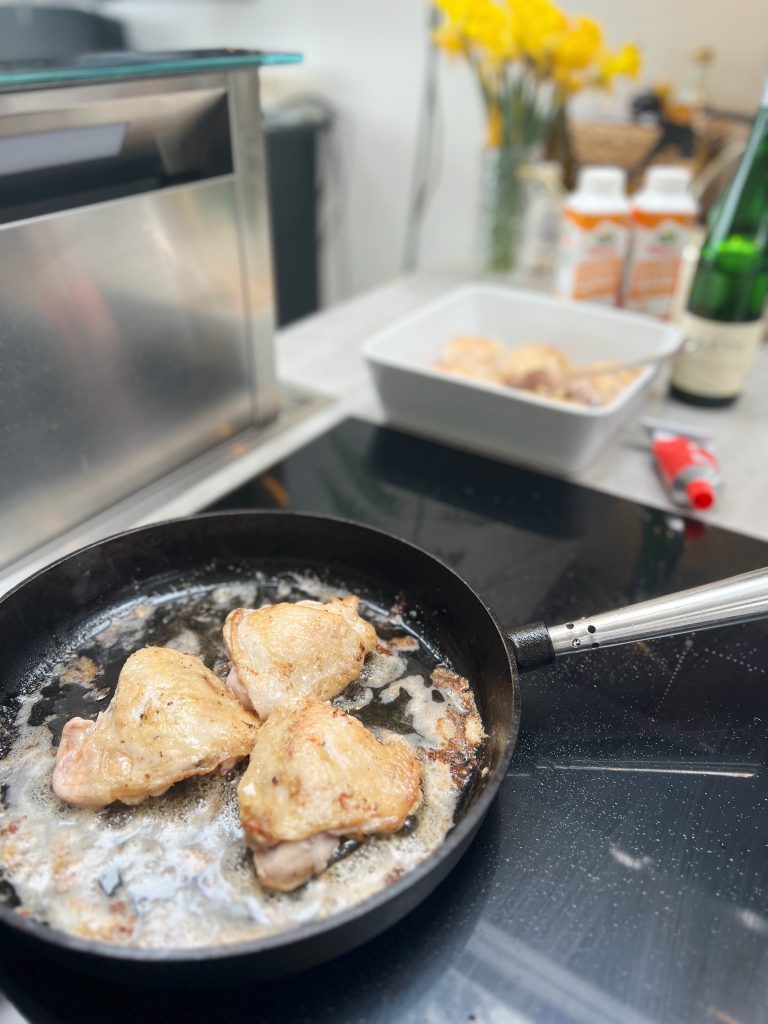 Börja med att bryna kycklinglåren i smör och olja. Salta och peppra. Lägg sedan över dem i en ugnsfast form och kör dem på lite grill i ugnen på 200 grader medan du gör såsen.