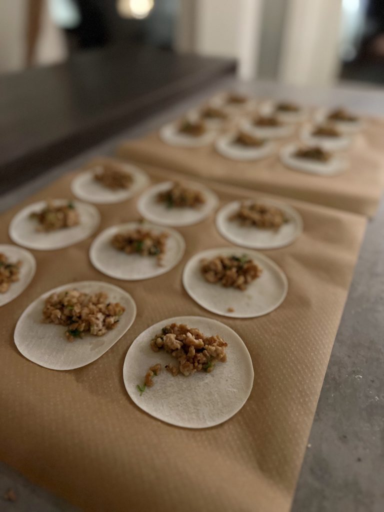 Börja med att laga fyllningen så att den hinner svalna innan degknytena fylls. Jag stekte kycklingfärs, lök, vitlök, sesamolja, mirin, kycklingfond, salt och svartpeppar innan jag smakade av med pressad lime och honung.