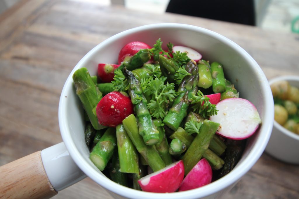 Kokade färskpotatis som jag slungade i smör och dill och råstekte sparris som jag blandade med rädisor