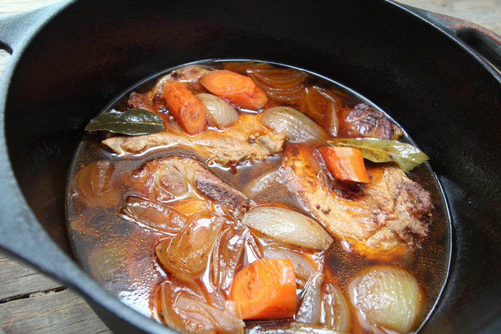 Jag stekte fläskkotletterna i stekgrytan och kryddat med salt och peppar. Tillsatte två gula lökar och en morot och hällde på en burk lättöl, 3 msk kalvfond och två lagerblad. På med lock och in i ugnen på 175 grader i ca 1 timma.