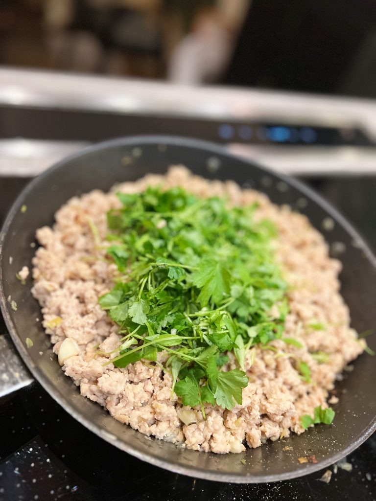 Stek kycklingfärs tillsammans med en hackad gul lök eller två! När det börjar bli klart så tillsätt krossad, finhackad vitlök. Smaka av med mycket vitpeppar, kycklingfond, salt, ingefära och sesamolja. Lite lime och honung och sedan är det klart.