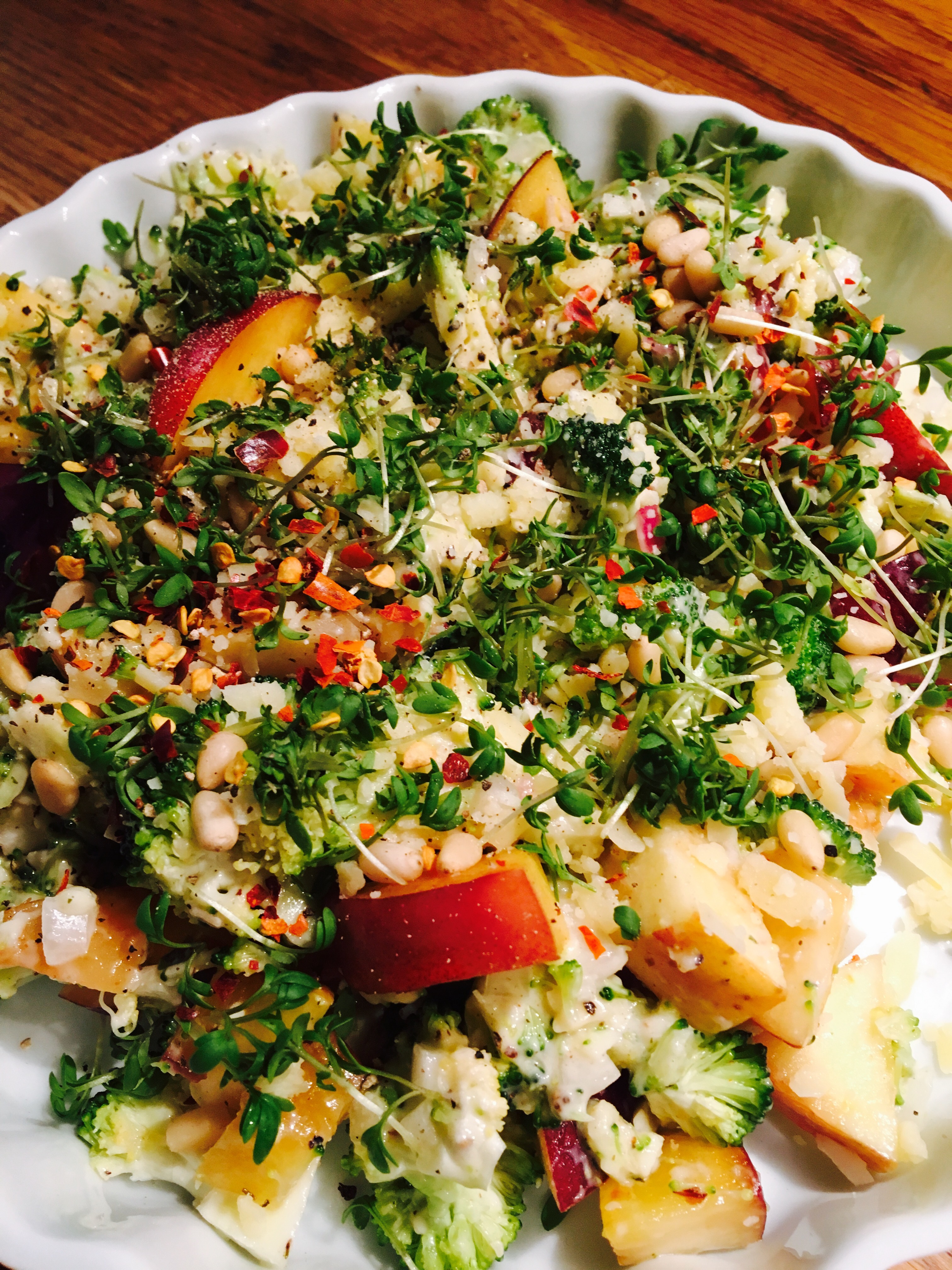 Blanda majonäs och prästost. Rör ner finskuren broccoli och rödlöken. Lägg upp på ett fat. Toppa med grillad nektarin, äpple pinjenötter och krasse. Krydda efter smak med flingsalt, svartpeppar och chiliflakes!