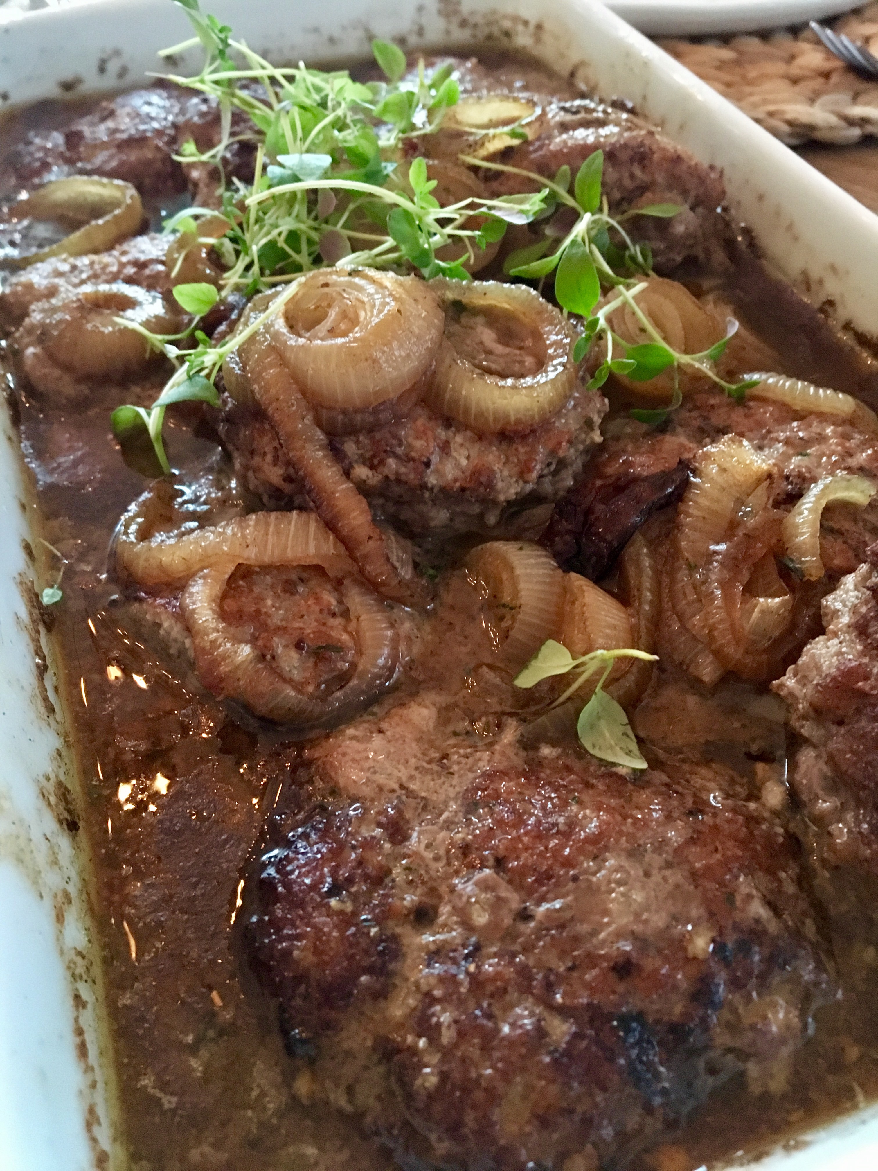 Skiva gul lök och stek efter pannbiffarna i samma panna. Tillsätt något litet socker så löken blir karameliserad. Häll på vatten och grönsaksfond. Puttra ihop lite. Häll över pannbiffarna och sätt i ugnen med folie över på 150 grader tills pannbiffarna är klara.