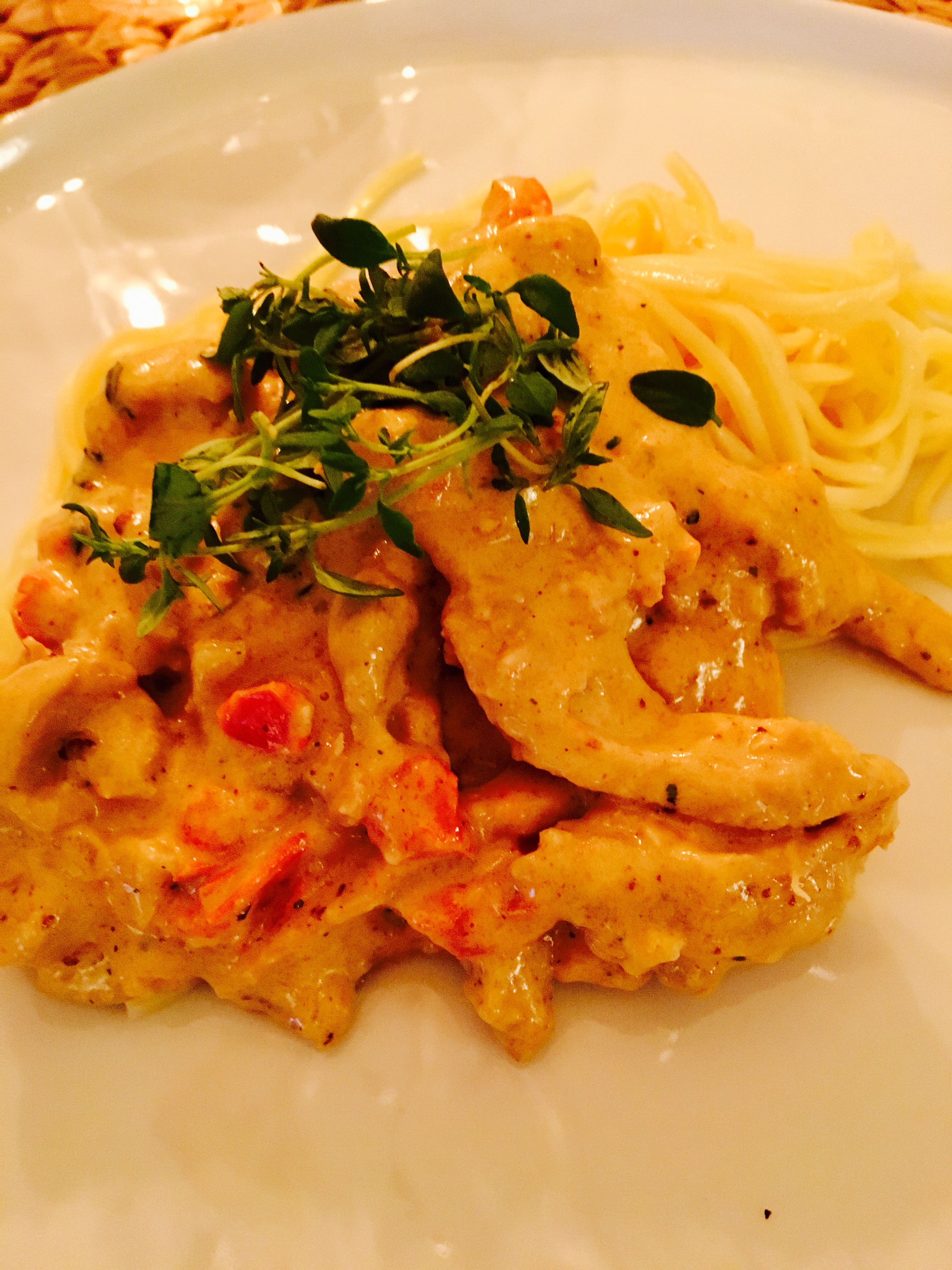 Vad det blev!? Urgod pasta med currykyckling. Förutom curry hade den vitlök och färsk timjan! Så gott!!! Jag tog disken… 😉