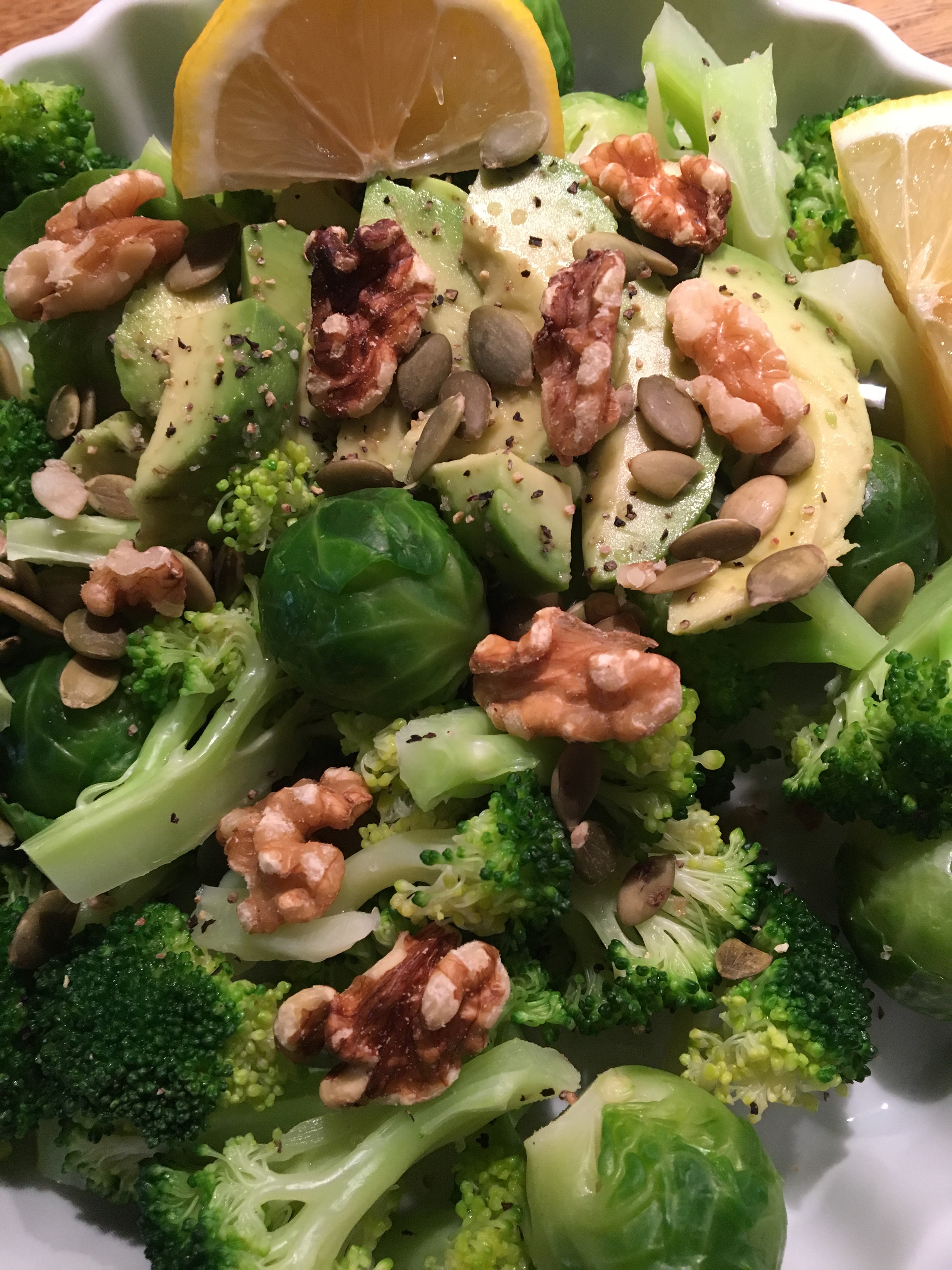 Jag och Lisa åt en grön vitamin-bomb sallad till! Brysselkål, broccoli, avocado, citron och nötter!