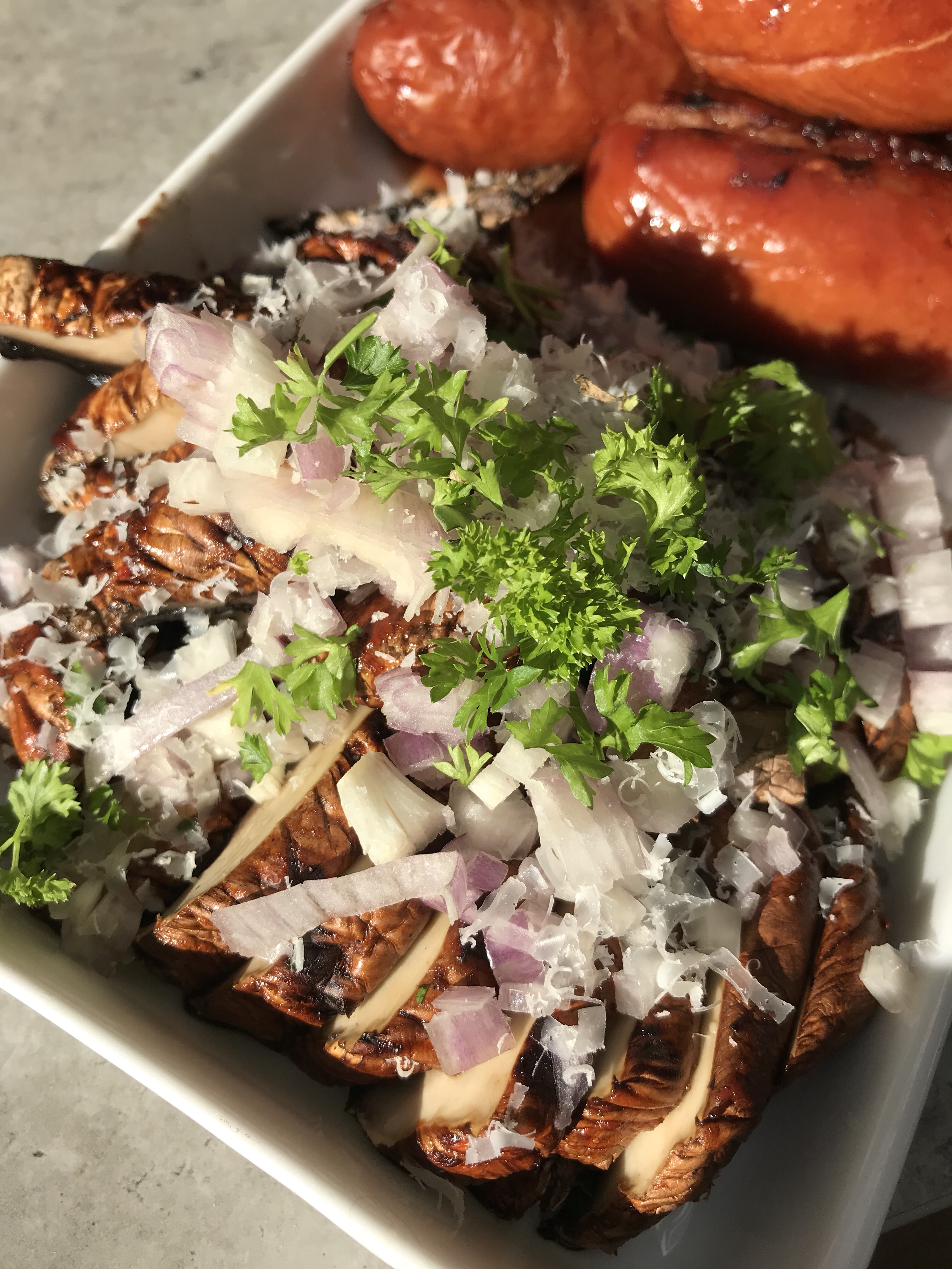 Vi grillade kött, korv och portabellasvsmp! Åt vitlöksrostad färskpotatis, sparrissallad med parmesan och bea till!
