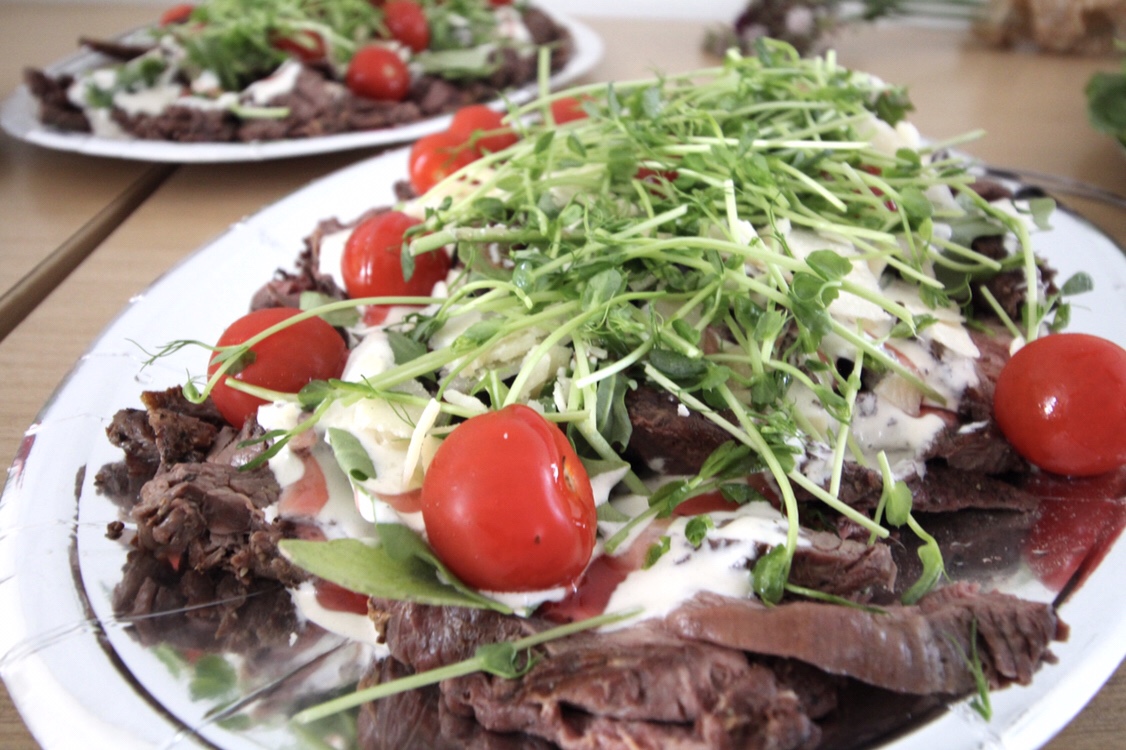 Men buffén bestod av lättgrillad oxfilé i tunna skivor som toppats med pepparrotscreme, ruccola, parmesan och picklade små tomater. Dessutom kycklingrullar fyllda med en röra på färskost, örter och citron. En ceasarsallad, potatissallad, bröd, knäckebröd och ostar.