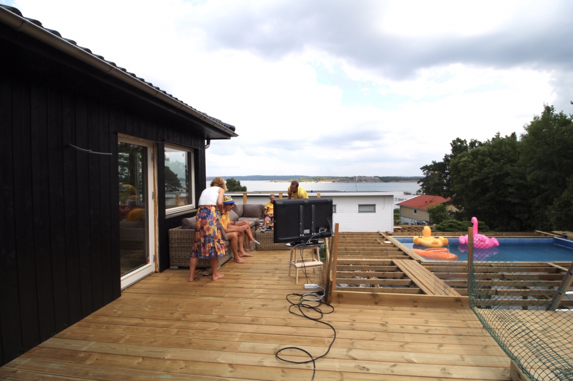 Efter lunchen skyndade vi hem till fotbollsmatchen. Vi fick sällskap av Fam Hallin och hejade så gott vi kunde där ute på altanen