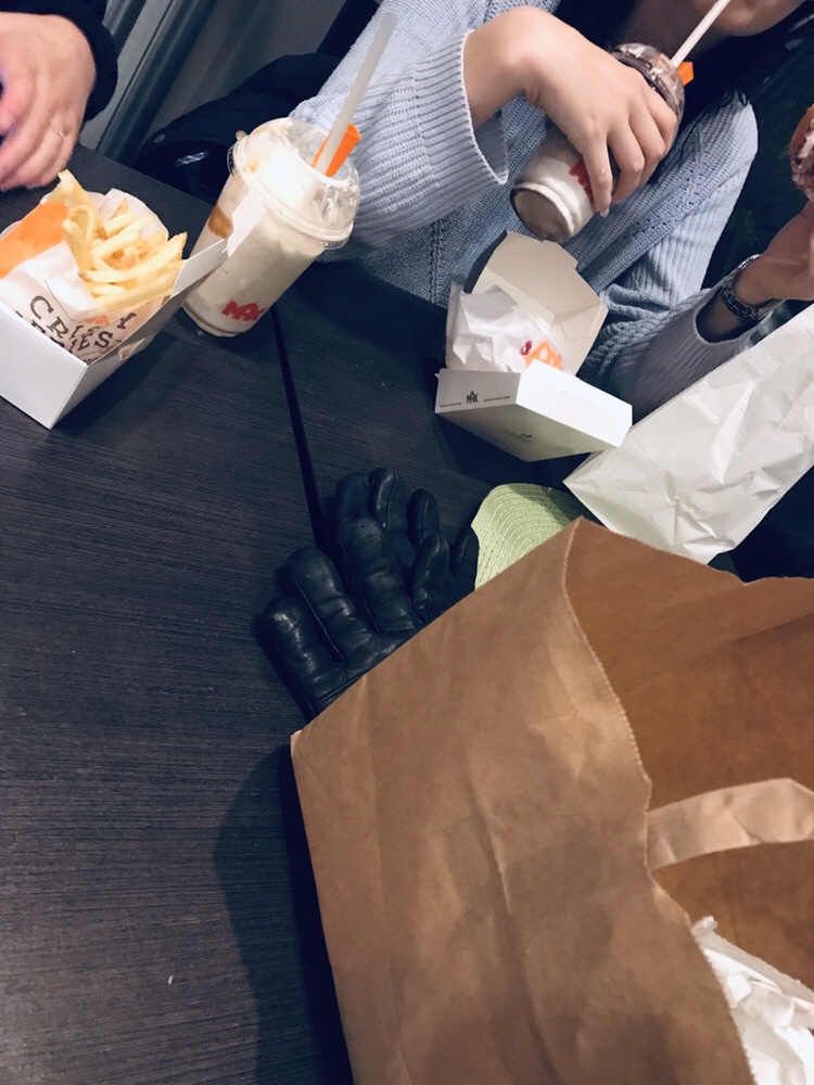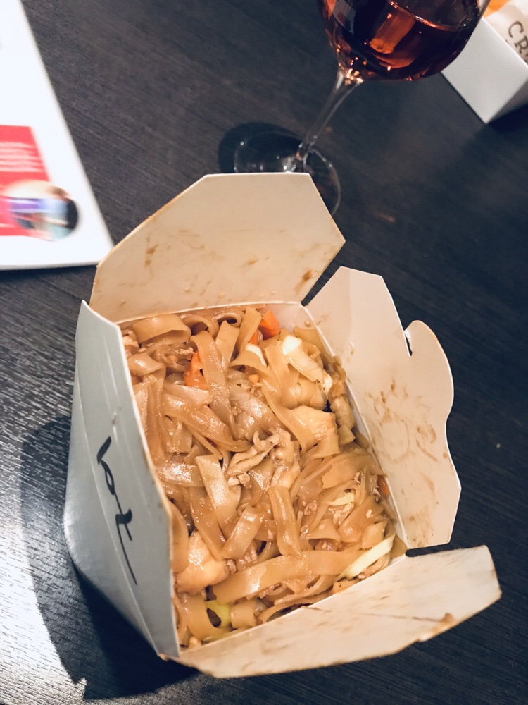 Det blev takeaway som vi åt i lobbyn med dryck från baren