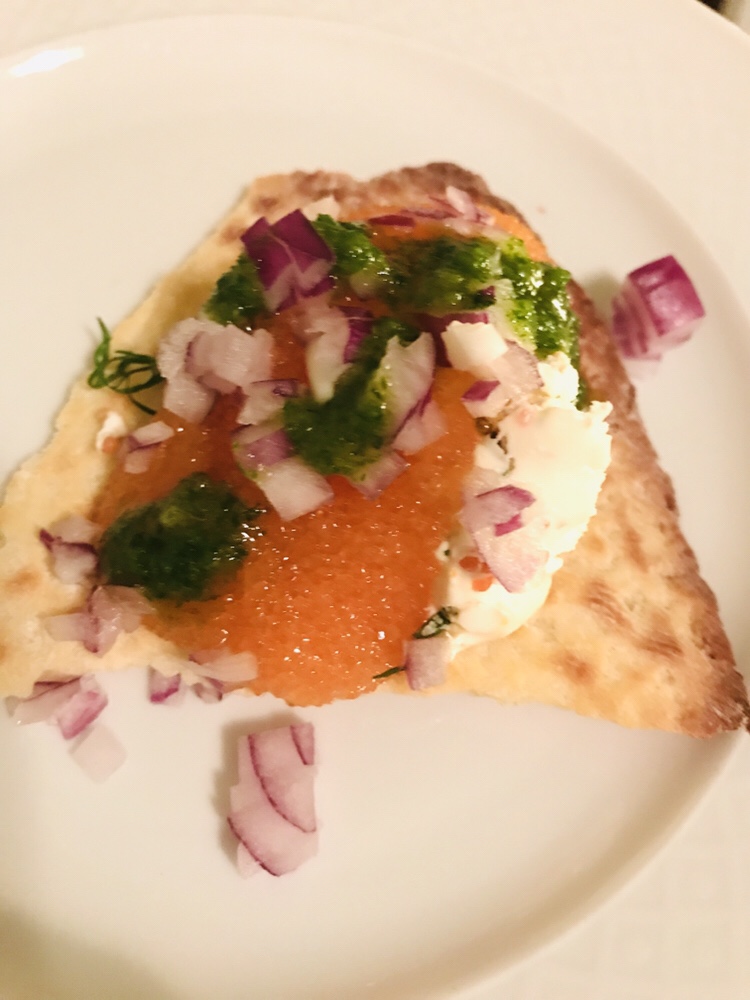 Vi inledde med Taittanger och toast på Ingers (Tobias mormors) tunnbröd, med kalixlöjrom, rödlök och basilikaolja