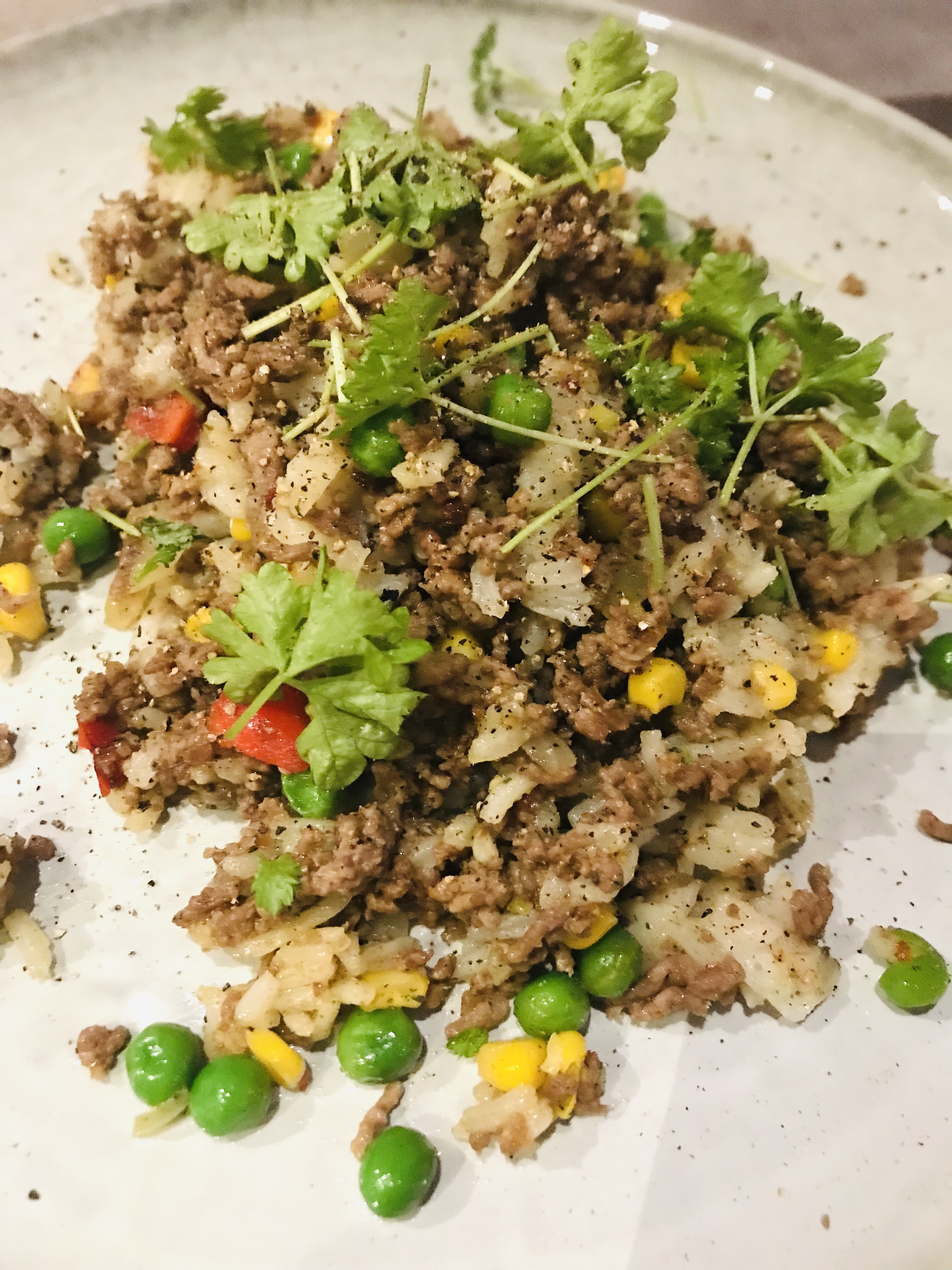 När köttfärsen är färdigstekt så tillsätt kokt ris. Blanda ordentligt och nu måste man krydda på så det smakar något. Mest salt och peppar men även chili om man gillar det. Tillsätt till slut frysta ärtor, majs och paprika och låt bli varmt