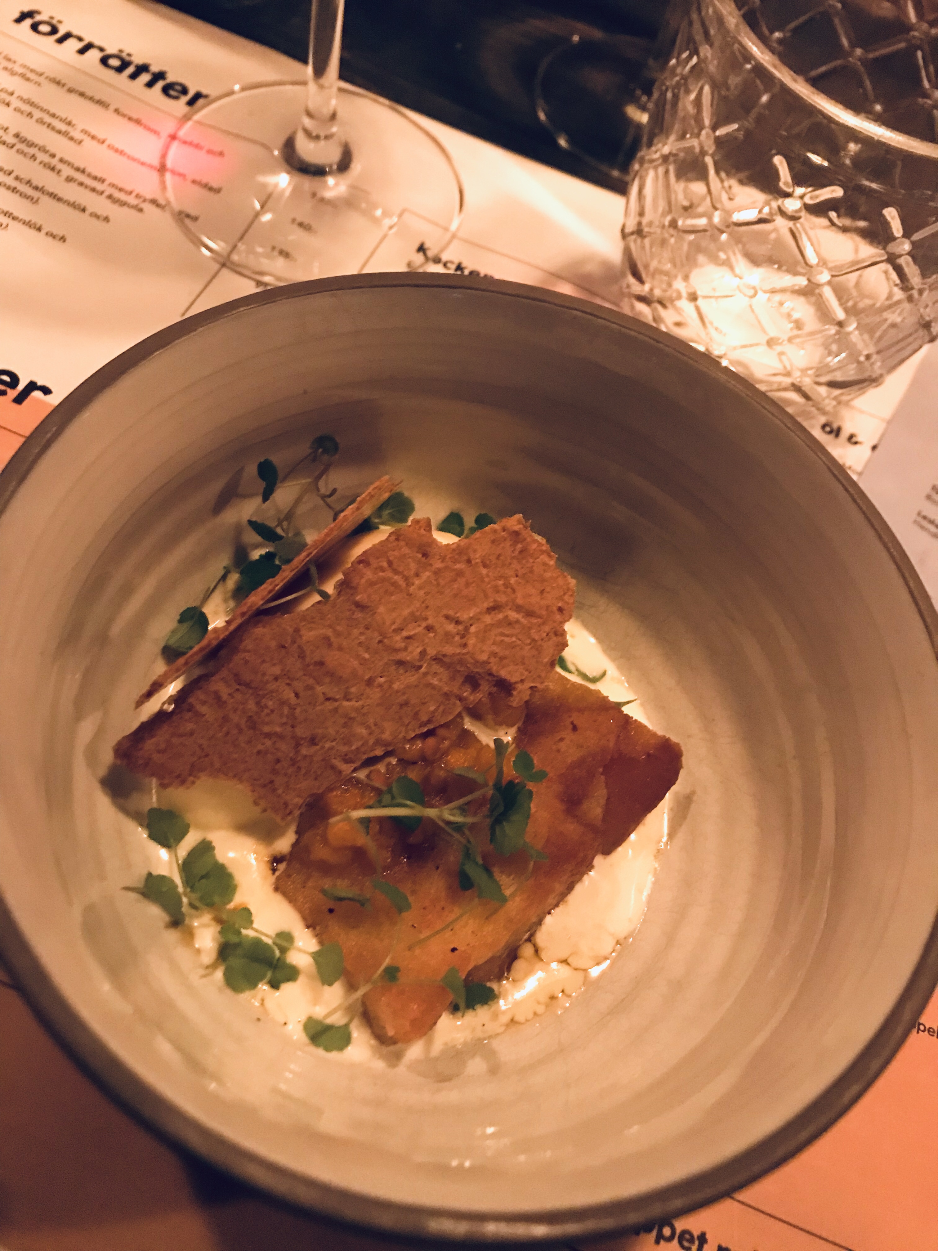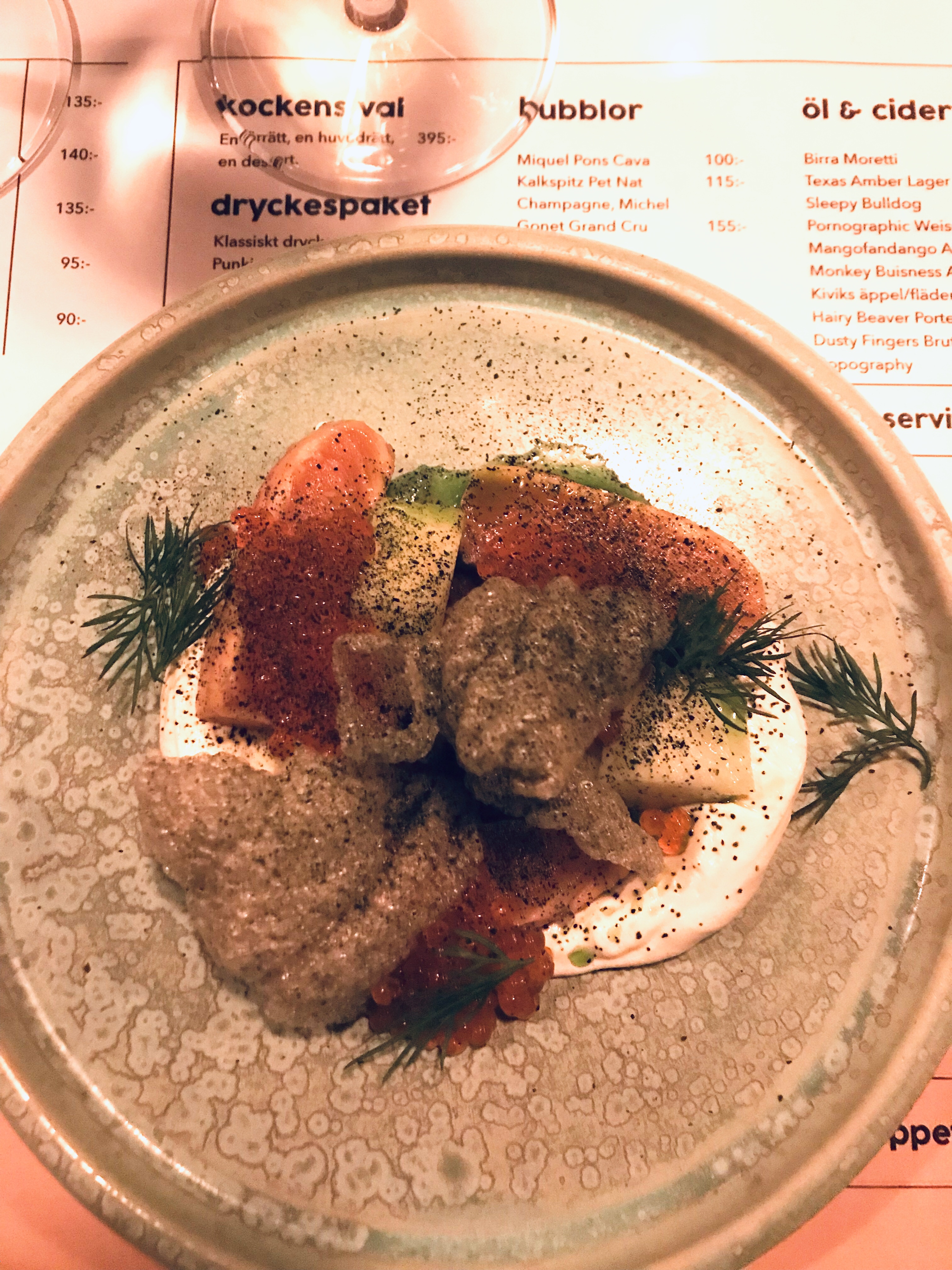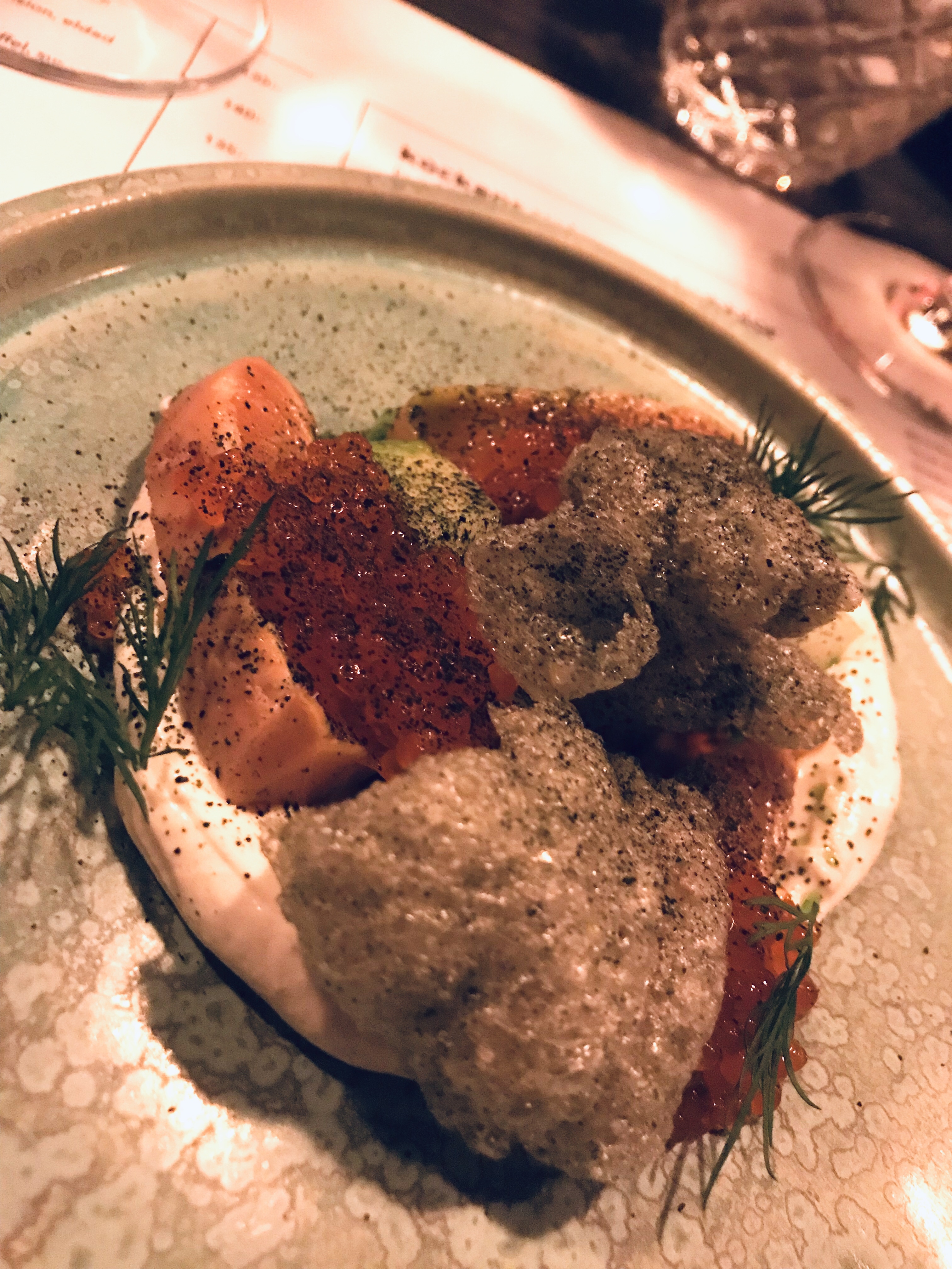 Förrätt på lax, rökt gräddfil och alger; mycket gott!