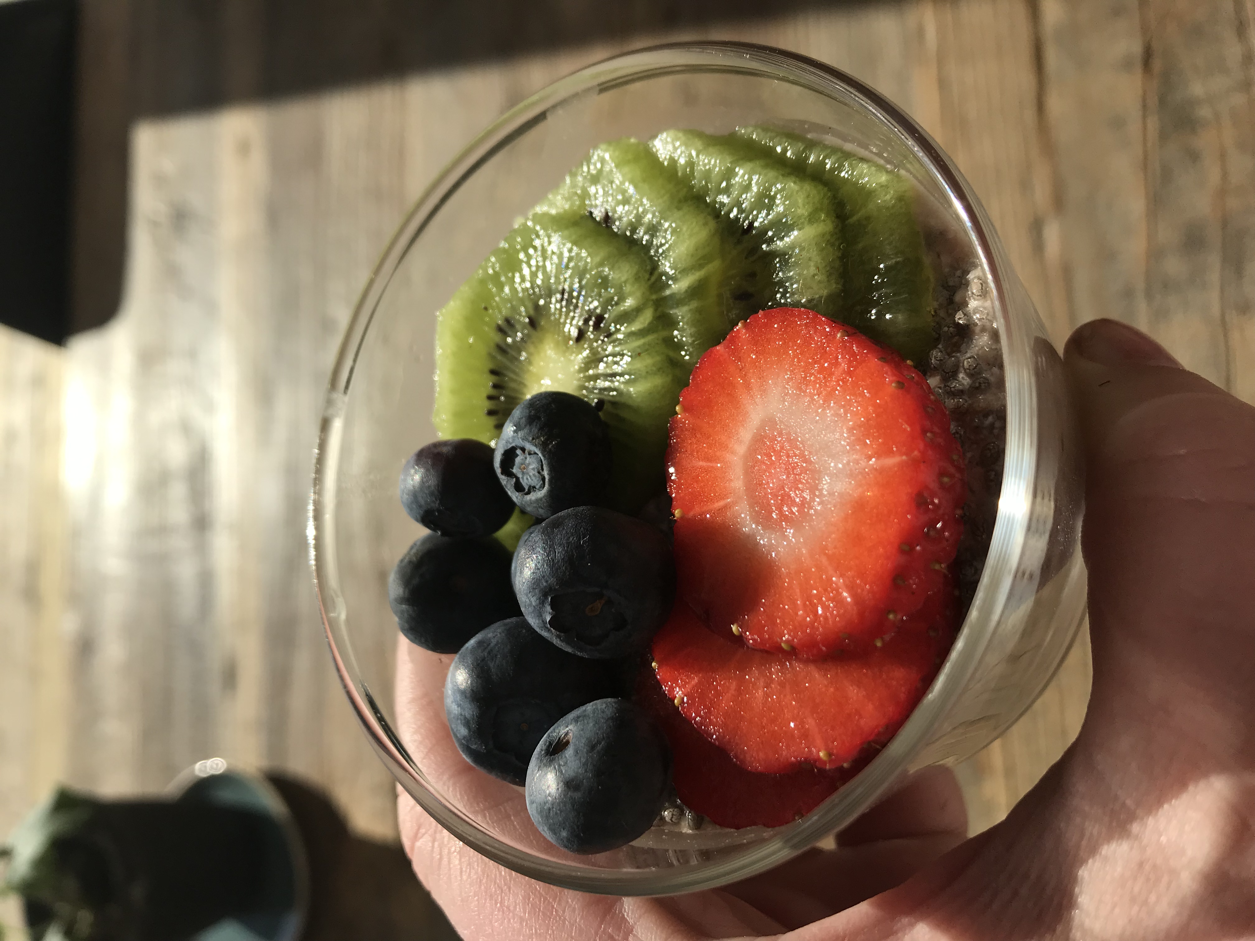 Blanda sedan med chiafrön och häll upp i glas. Låt stå över natten och toppa sedan med frukt och bär!