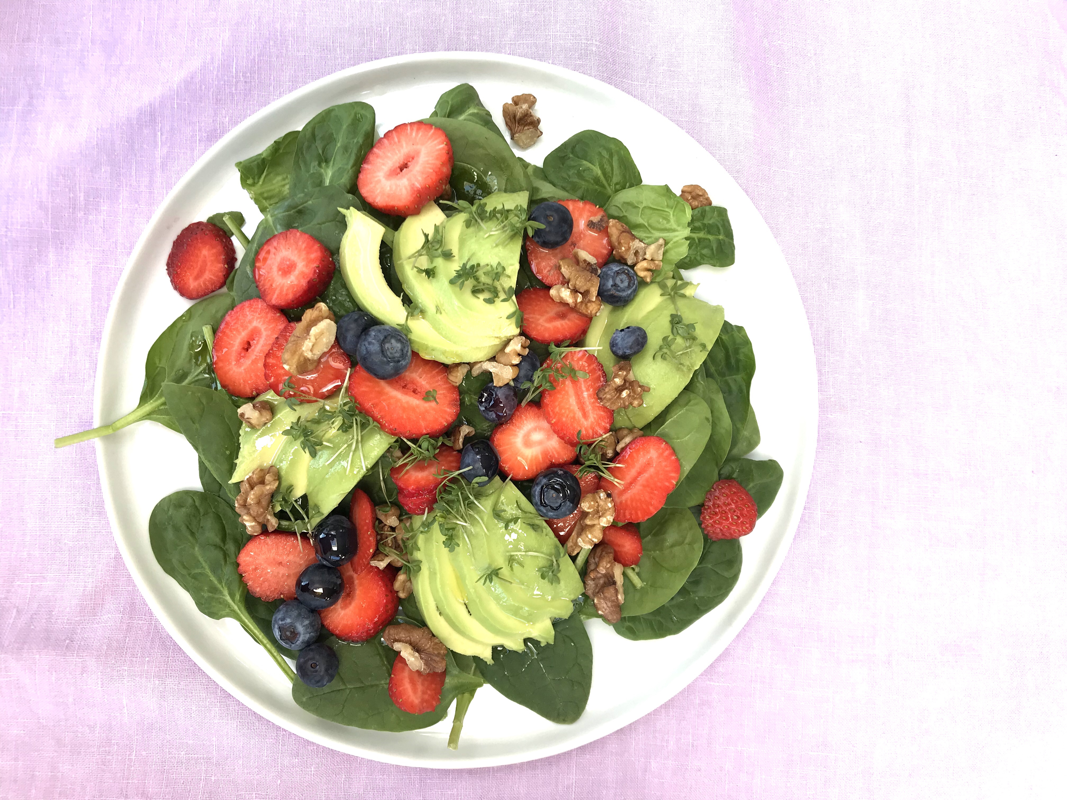 Här kommer en riktig favoritsallad! Så somrig! Jag brukar bara ha på olivolja, krassen och valnötterna tillsammans med blåbär och jordgubbar smakar tillräckligt mycket ihop!