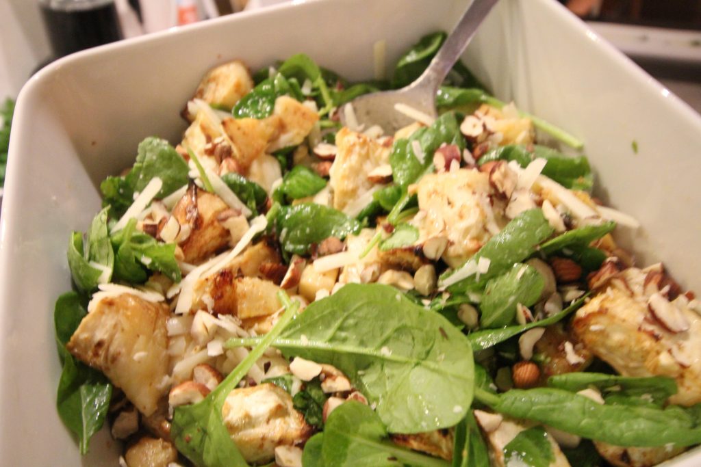 När rotsellerin är klar så pressa över citron. Blanda ner sallad och riven parmesanost och toppa med hackade hasselnötter.