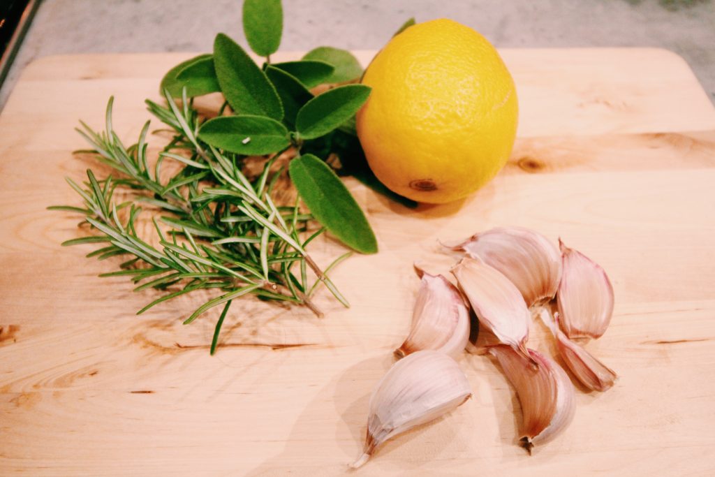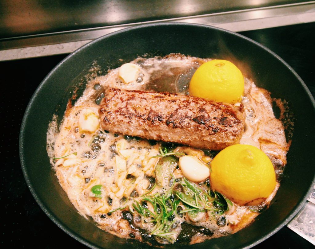 Jag stekte på på filen runt om i en stekpanna. Mot slutet tillsatte jag både hela vitlöksklyftor och krossade i smöret. Smulade ner salvia och rosmarin och stekte citronhalvorna