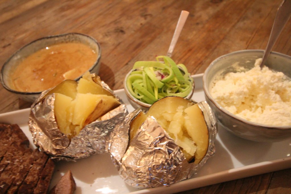 Jag serverade med bakad potatis som toppades med en fetaoströran och skivad purjolök.