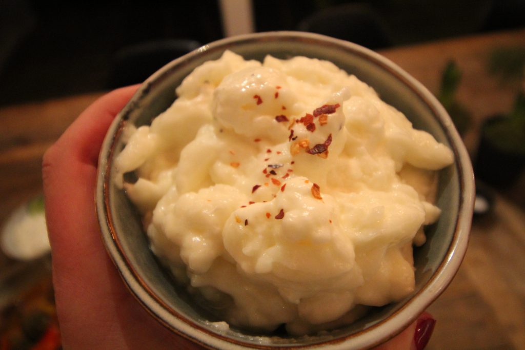Serverade med tabbouleh, tzatziki och Zeinas Toum. Toum är en vitlökscreme som påminner om ceasardressing, fast man använder äggvitor istället för äggulor. Väldigt fluffigt och gott!