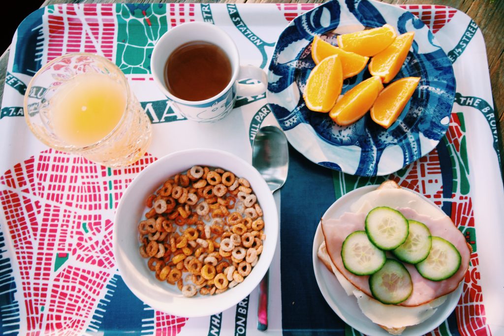 Apelsin, te med mycket honung, smörgås, äpplejuice och goda flingor med mjölk. Och Alvedon.