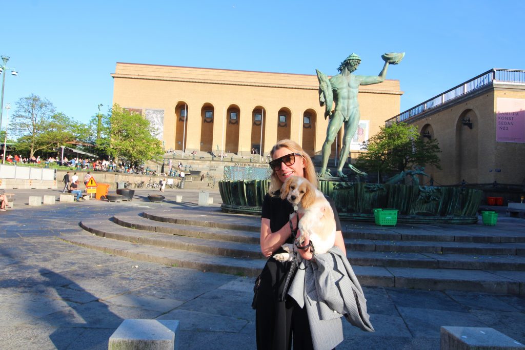 Har man en 13 veckor gammal valp så skall han naturligtvis med. Bra träning för honom också att vänja sig vid ljud, trafik och människor. Om han klarade det? Han var helt fantastisk, charmade alla han mötte, fick vattenskålar och sov sedan under bordet
