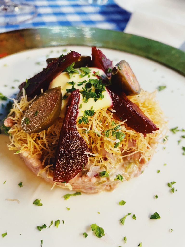 Jag kunde inte bestämma mig utan valde två förrätter… en råbiff (såklart!) och en med bakade betor med creme på fetaost