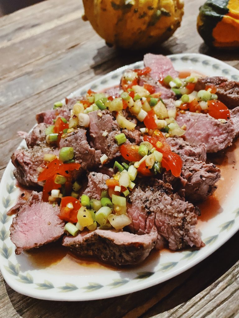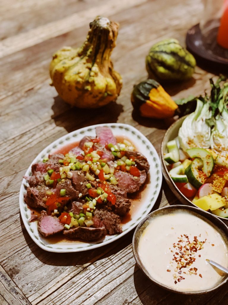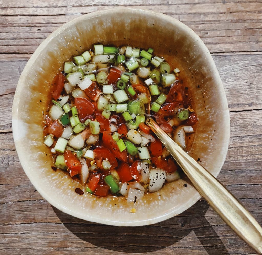 Vi grillade rostas som toppades med en dressing på sesamolja, pressad lime, japans soja, ingefära, salladslök, tomat och gurka