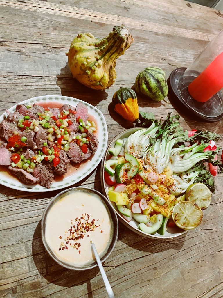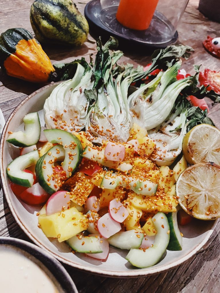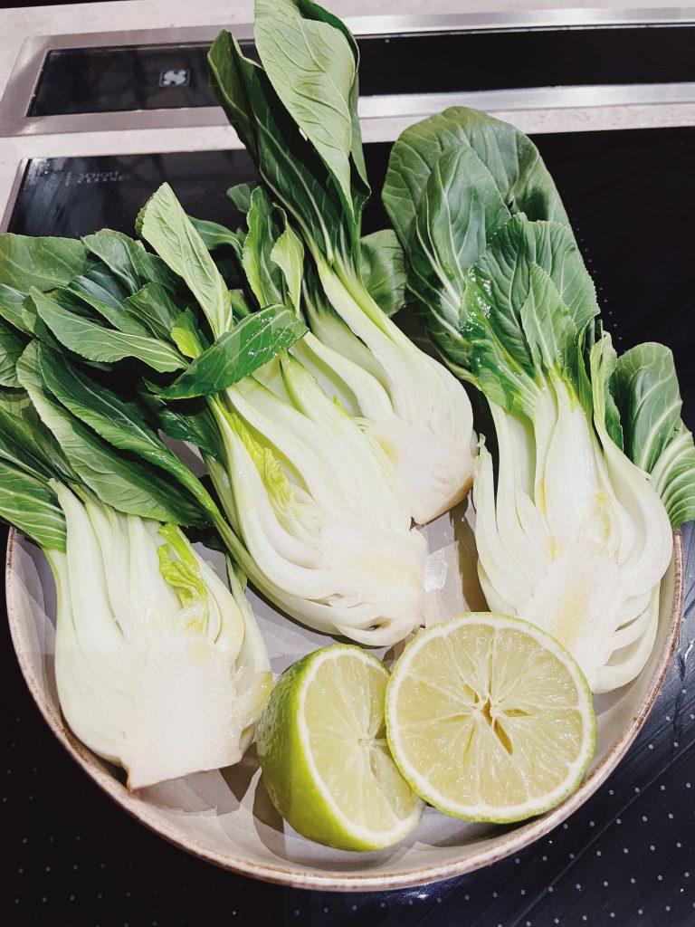Vi grillade även pak choi och lime som vi åt till köttet tillsammans med en varm sallad och en srirachamayo
