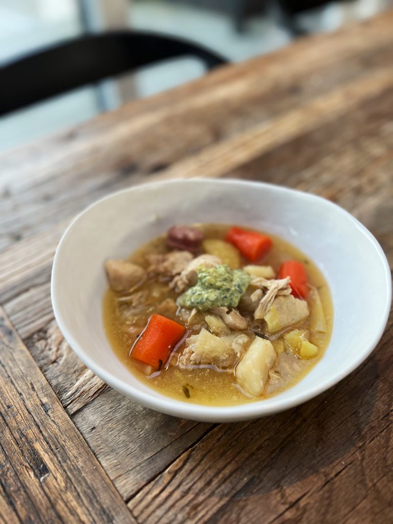 I lördags övertygade jag Mr T att köpa lite penséer i glada färger som han planterade i krukan på trappan. Medan han gjorde det öste jag ner majskyckling, rotselleri, morötter, potatis, lök, vitlök, vitt vin, fond och vatten i en gryta. Sedan skar jag salsiccia i bitar som fick koka med på slutet. Allt efter inspiration från nyhetsmorgon. Mr T mixade en ramjslöksmajo med mycket vitlök, kapris, ramslök (såklart), sardellpasta, äggula och olja. Som en varm kram i magen med mycket smak av major. Vitlök är väl bra när man är sjuk?