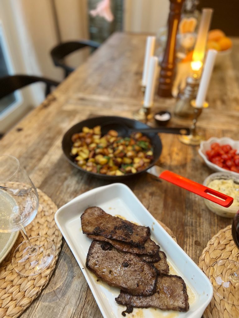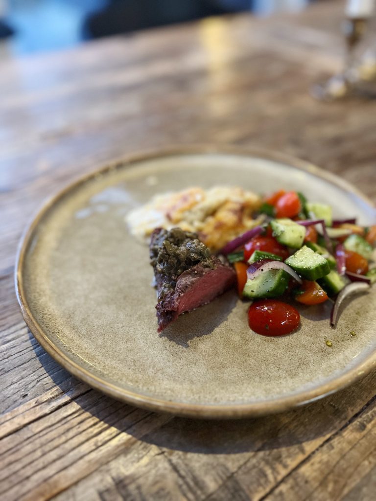 Serverade köttet med “au pif” på franskt vis med en kaprisröra. Väldigt, väldigt gott!