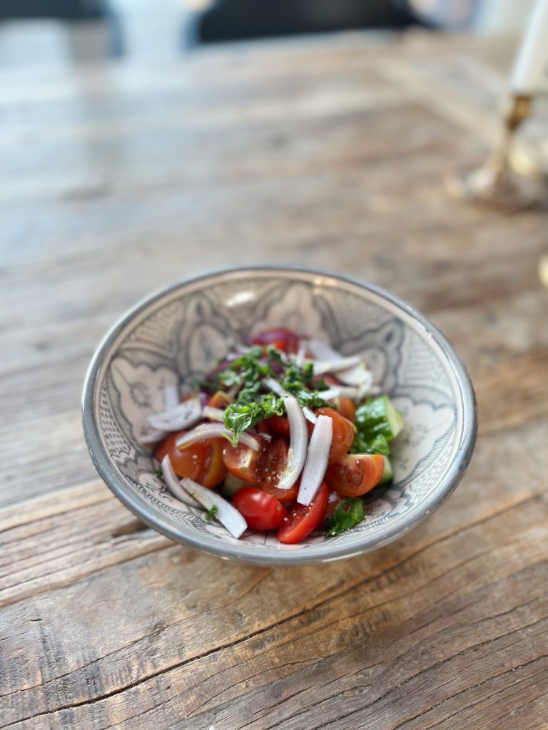 Såklart en sallad till. Faktiskt det enda jag är riktigt sugen på när jag är sjuk… Tomat, gurka, rödlök, olivolja och mycket svartpeppar och en gnutta salt.