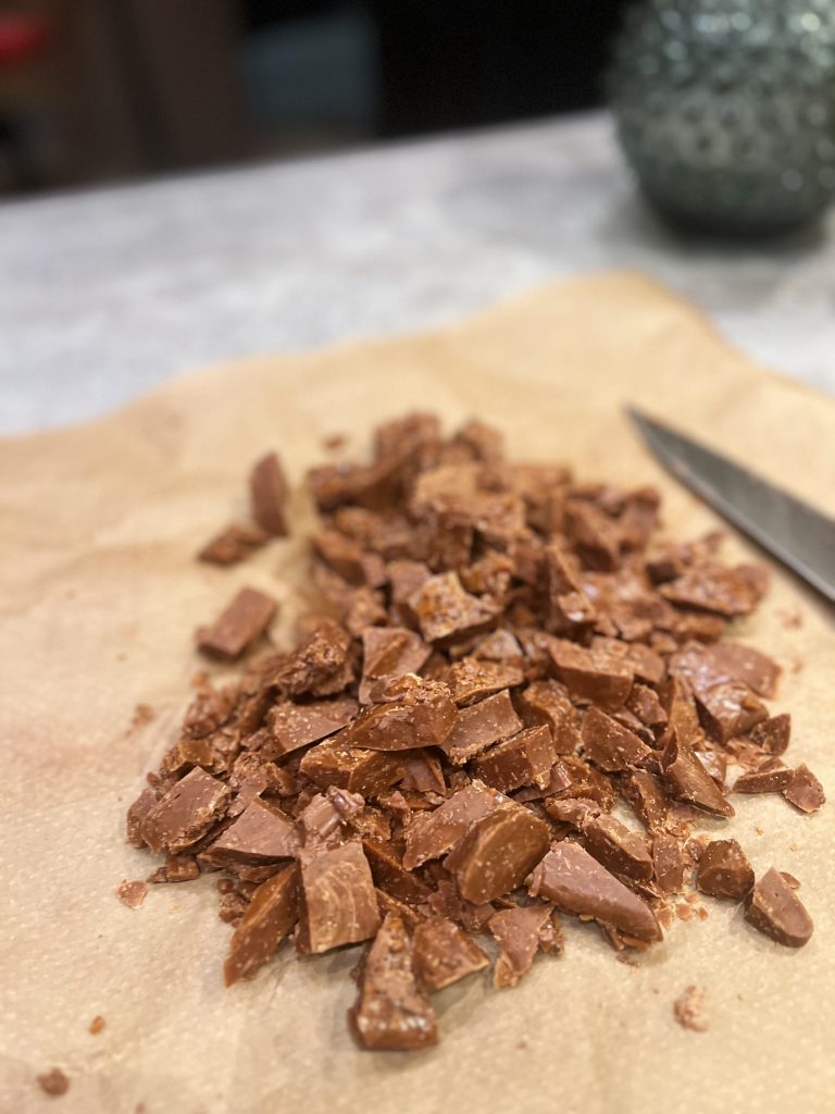 Det sista jag skulle göra igår var ett nytt recept på daim-fudge. Blev inte bra alls…. Skulle avvaktat med det till idag när jag tänker efter. Dels lagade jag middag samtidigt… Dels missbedömde jag tiden. Tycker alltid att det tar så lång tid att få upp temperaturen till 118 grader, men igår gick det raketfort. Termometern bråkade med mig och helt plötsligt var den uppe i 127 grader… Men smaken finns där och jag kallar det istället för daim-bräck;-)