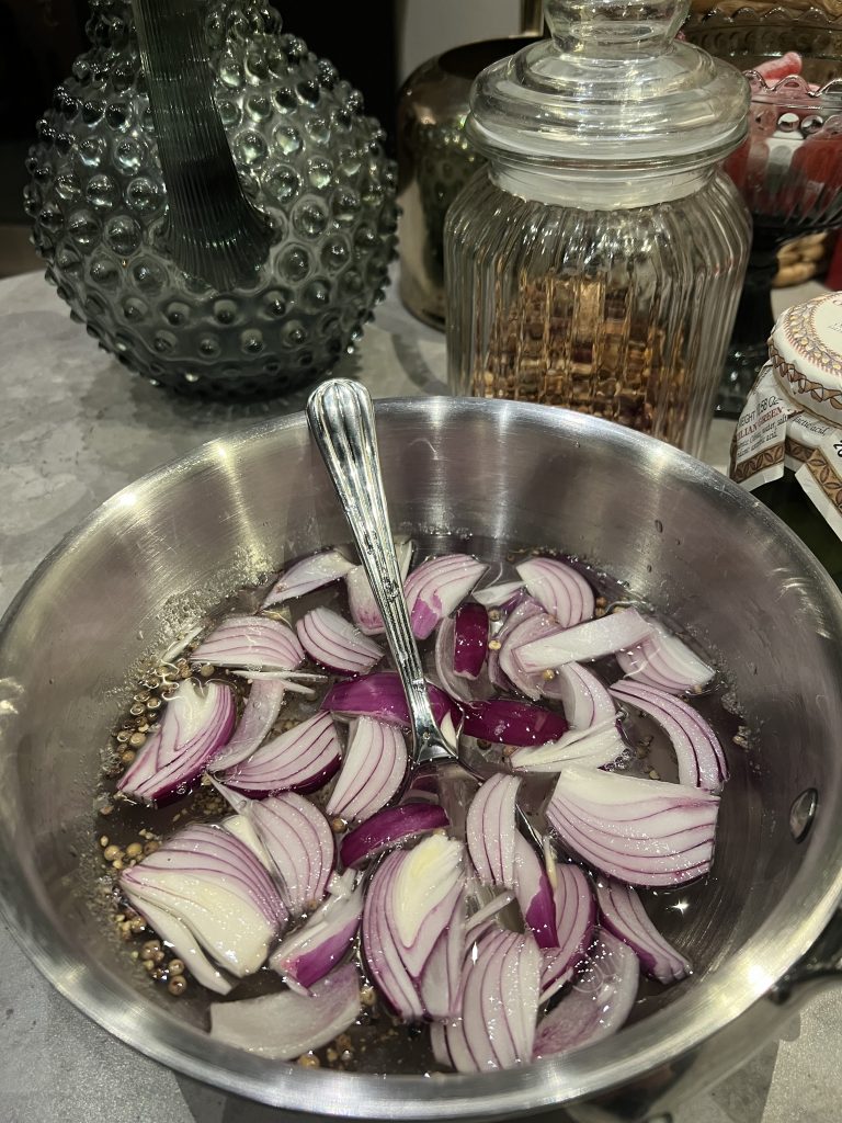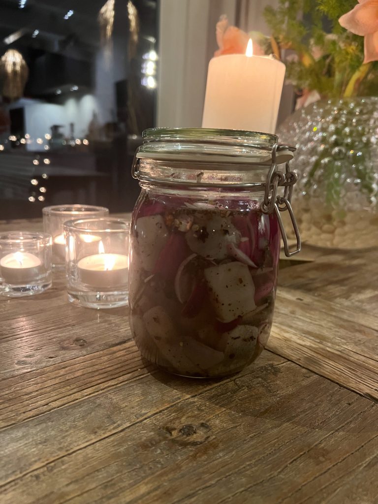 I år har jag lagt en en sill med egen kryddblandning. Ville gärna ha rödlök, enbär, kryddpeppar, svartpeppar och vitpeppar. Jag mortlade det och kokade ihop en 1-2-3 lag med pepparn. Lät lagen svalna helt innan jag la i löken. Köpte 5-minuters sill i färdiga bitar.