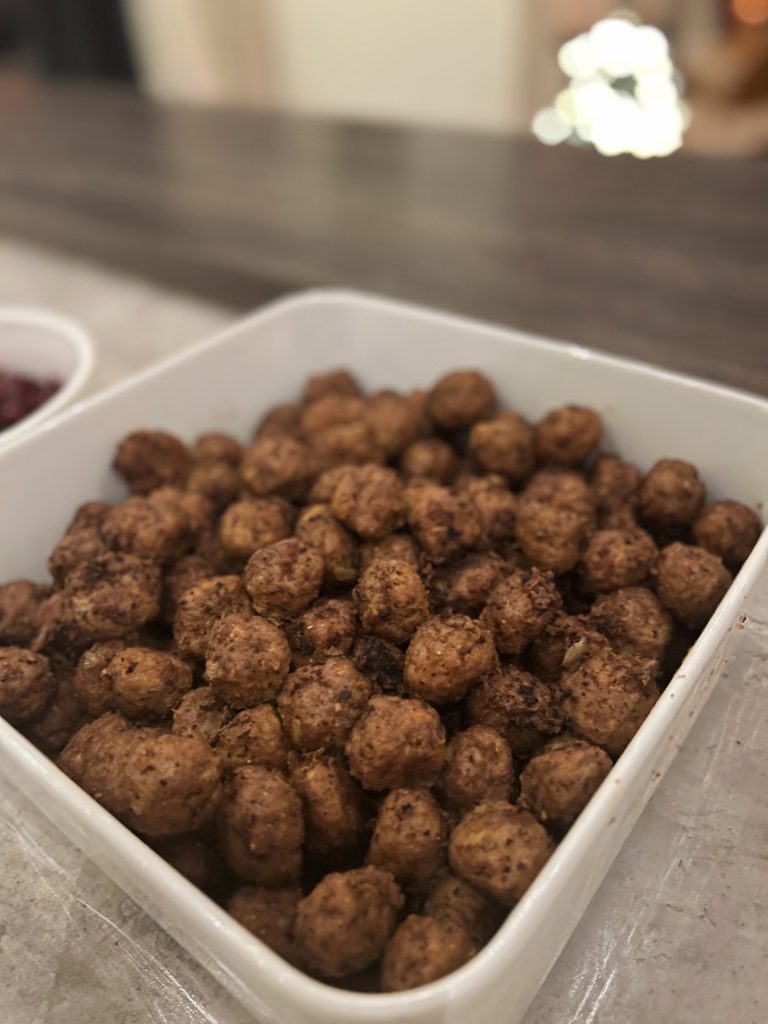 Jag har även rullat köttbullar, närmare bestämt 160 stycken… Just köttbullsrullningen tycker jag inte är så kul måste jag erkänna, men att fixa smeten (ströbröd, gräddmjölk, kalvfond, salt, kryddpeppar, stekt lök, sirap, vitpeppar och dijonsenap) gillar jag.