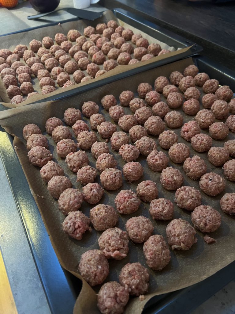 Rullar alla köttbullar och lägger på plåtar som får gå i ugnen på 225 grader i ca 10 min. Sedan steks de i smör