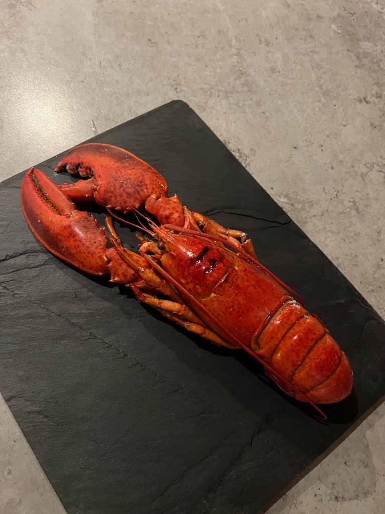 Dela hummern på längden och plocka bort magsäcken som sitter längst upp på kroppen innan huvudet.