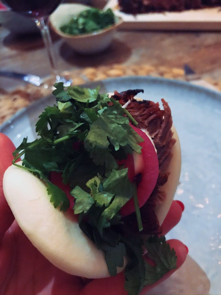 Vi åt detta med soft buns, färdigköpt aioli, picklade rödlök och koriander! Skivade även gurka tunt i mandolinen som toppades med rostade sesamfrön. En succé här hemma kan jag meddela!
