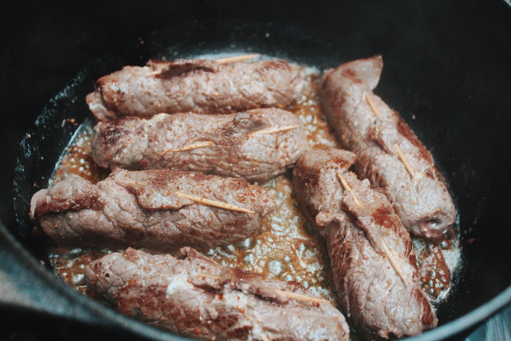 När rulladerna är brynta runt om så häll på matlagningsgrädde och kalvfond. Låt det koka ihop ca 30-45 minuter på svag värme så att köttet blir riktigt mört.