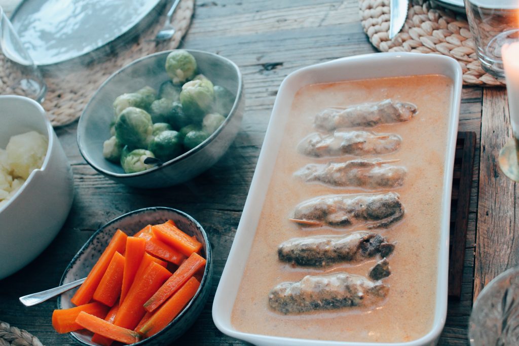 Jag serverade rulladerna med kokt potatis, brysselkål, smörslungade kokta morötter och hemmagjord gelé från i somras