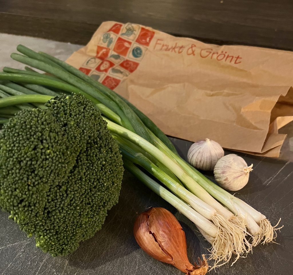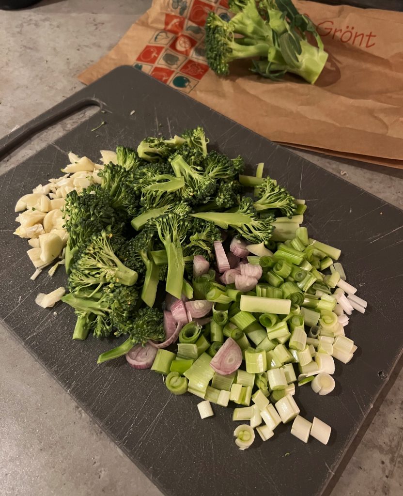Skär sedan kyckling i små bitar och skär även grönsaker som du gillar. Jag brukar använda lök, vitlök, salladslök och broccoli