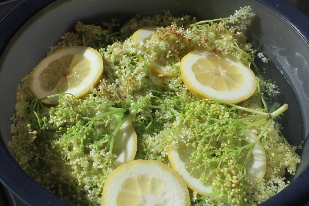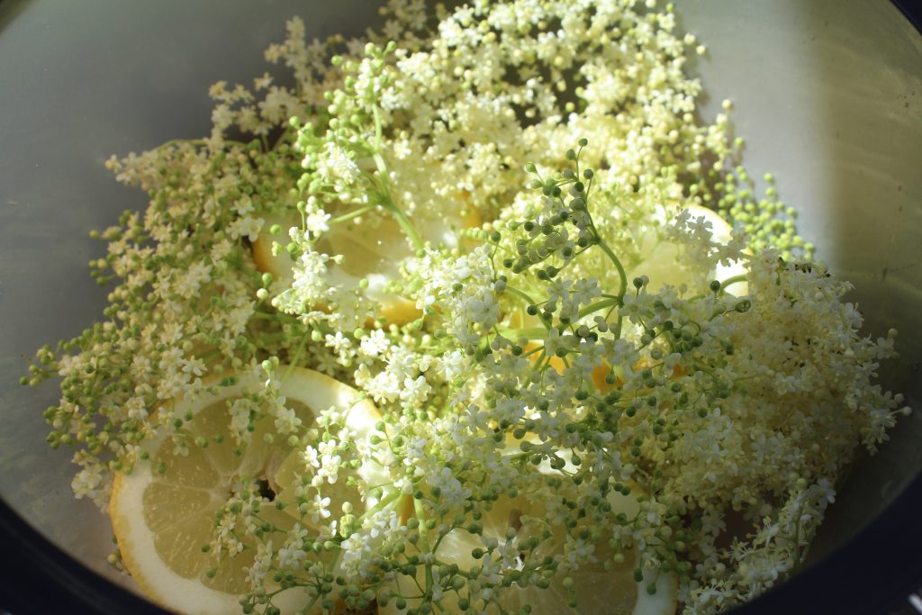 Koka upp lika delar vatten och socker, till 20-25 blommor brukar 1,5 liter vara lagom. Rör så att sockret löst sig och stäng av plattan. Tillsätt 1 msk citronsyra och rör om
