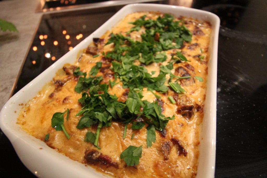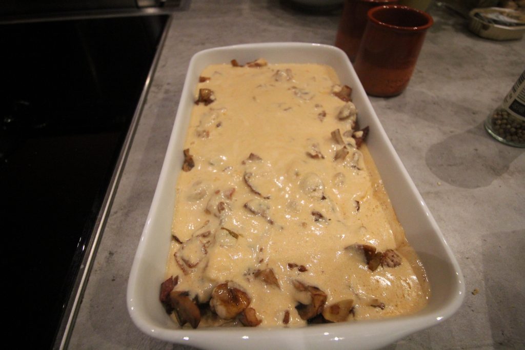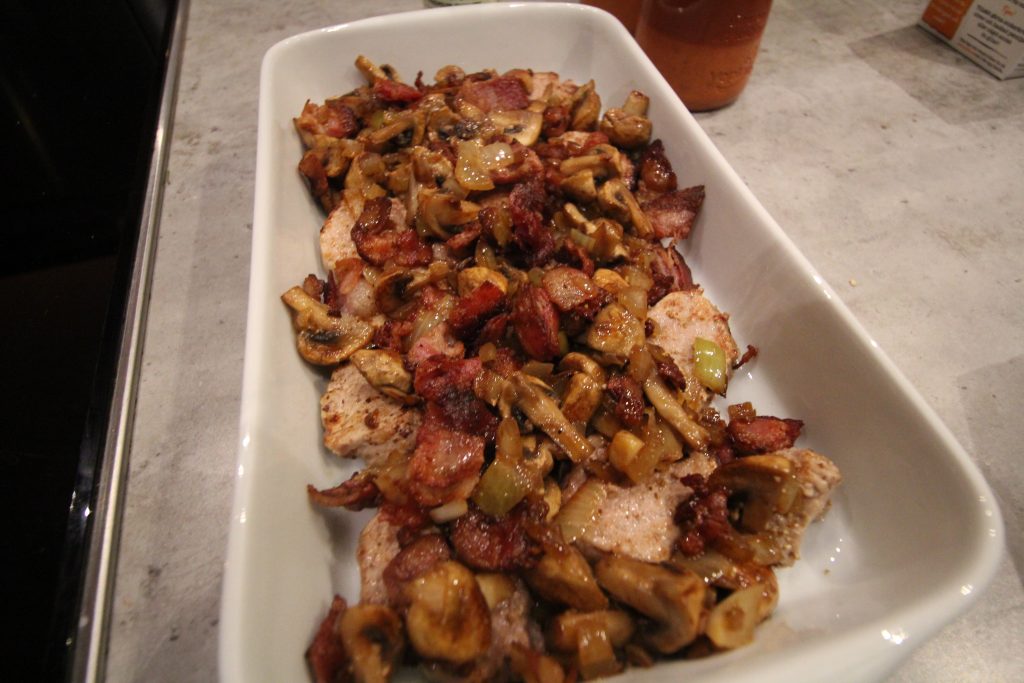 Maten då? Jo gratinerad fläskfile med champinjoner, lök, bacon och grädde. Väldigt god och lätt att göra.