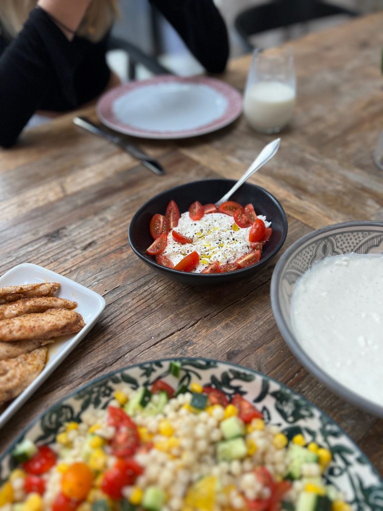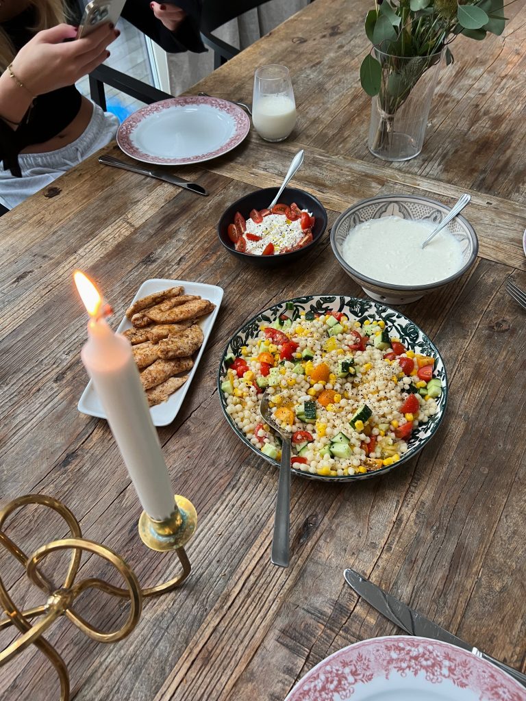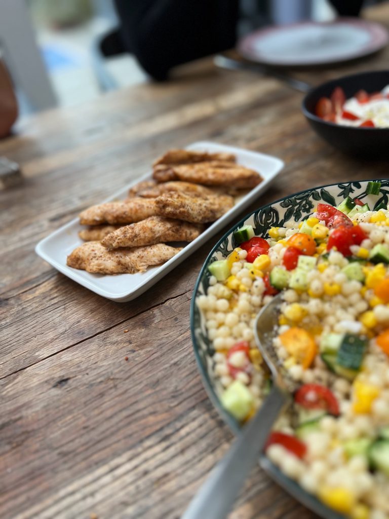I måndags lagade hon kyckling med pärlcouscous och en fetaoströra.