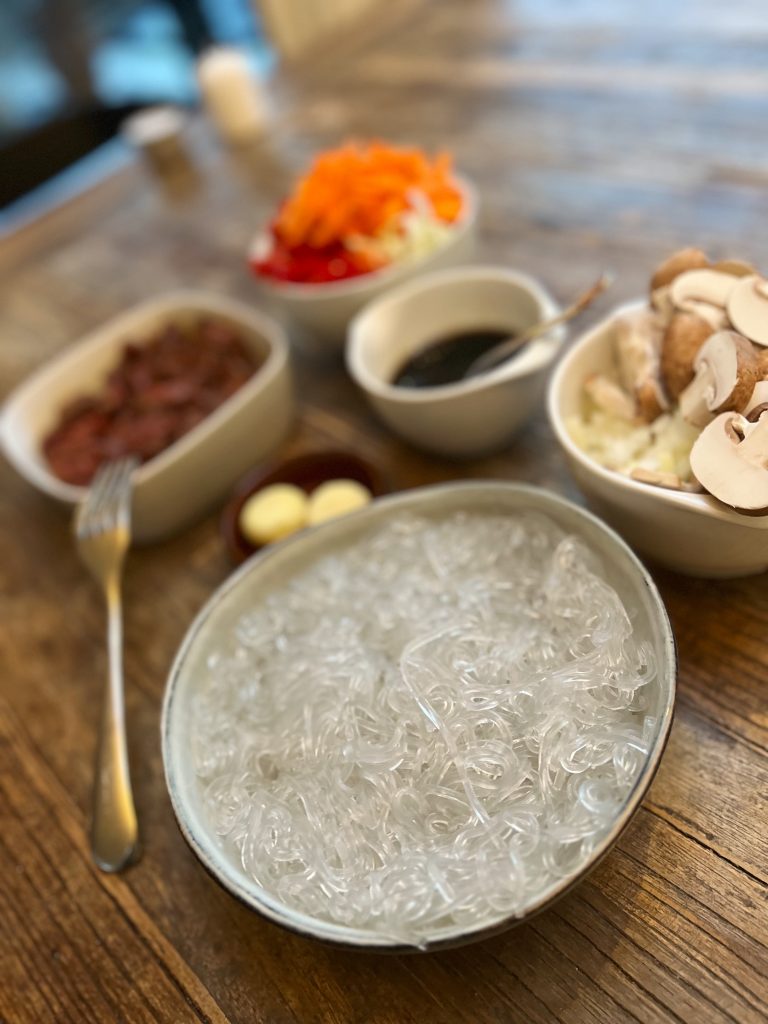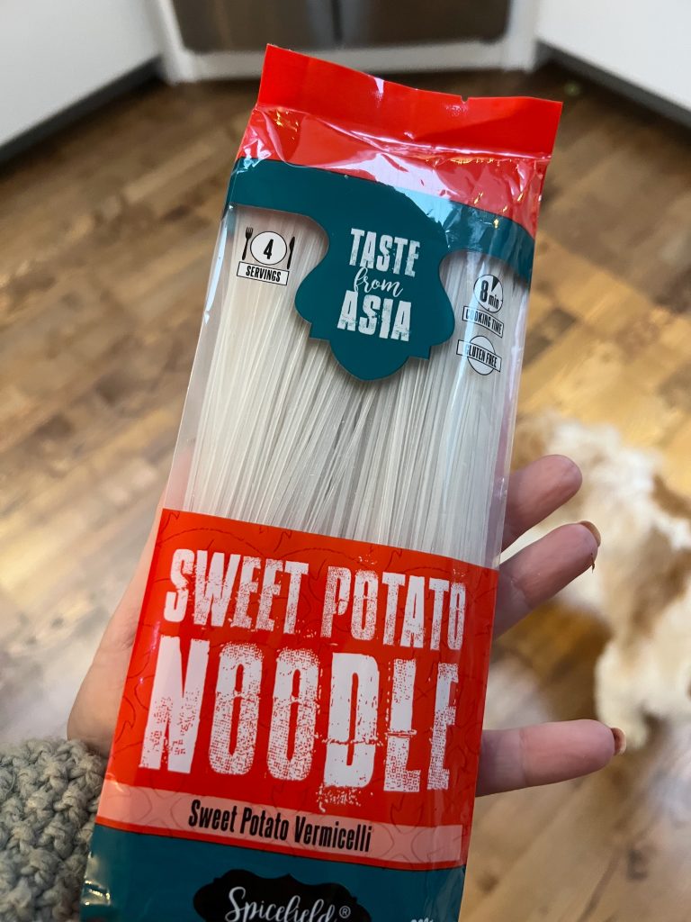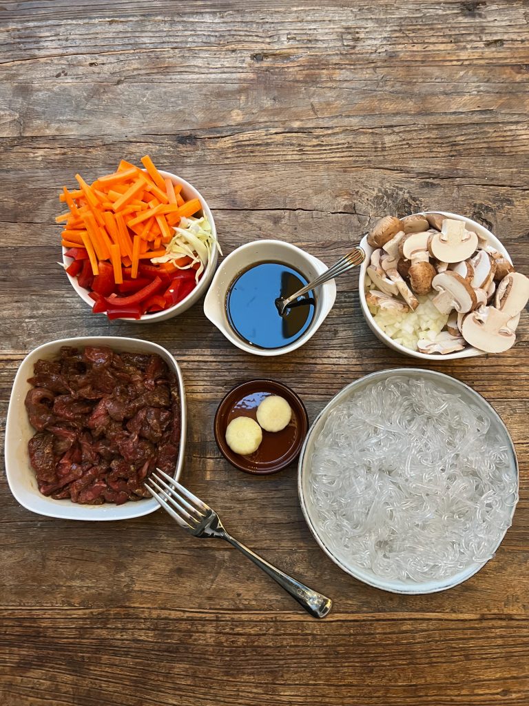 Förbered alla grönsaker; strimla grönsaker och skiva svamp. Koka sötpotatisnudlar. Jag använde dessa