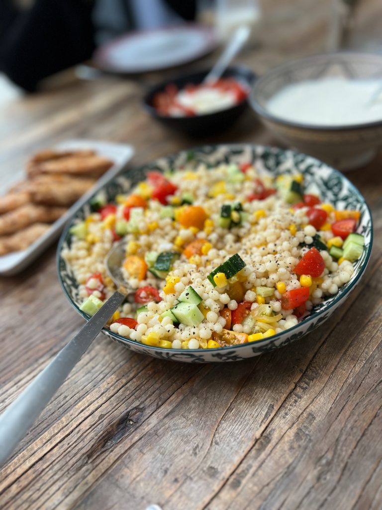 Burrata och tomater till som lite extra bonus! Väldigt, väldigt gott alltihop och pärlcouscous är inte varje dag vi äter här hemma… gör ni?