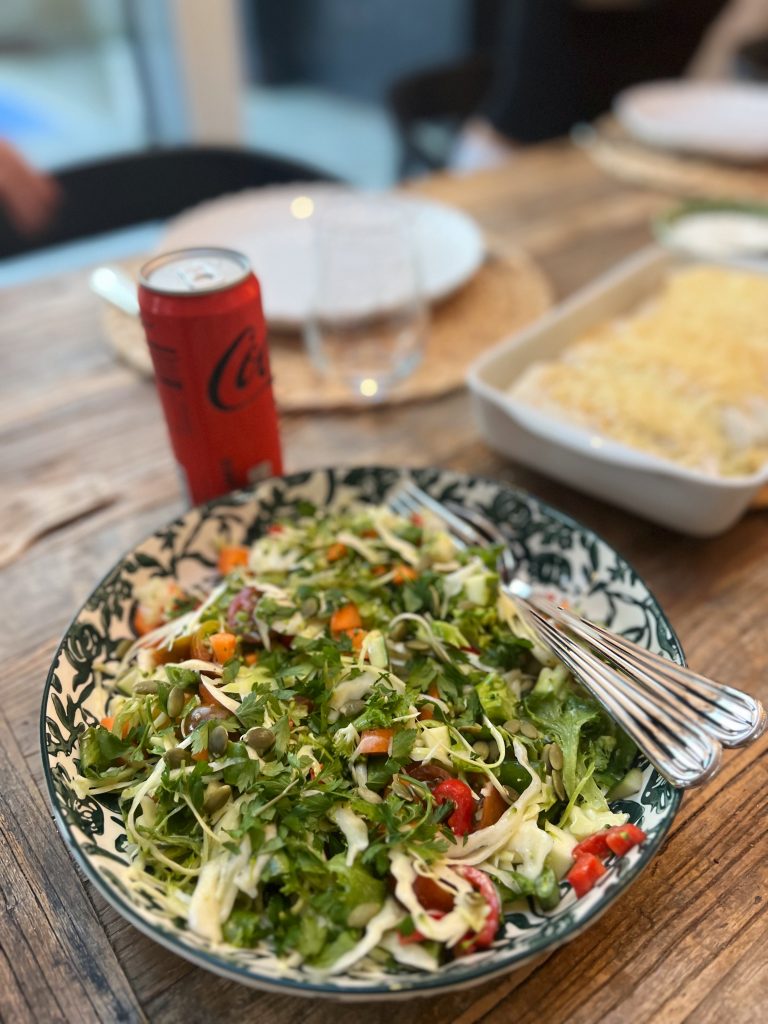 Jag som måste ha sallad till allt slungade färsk vitkål, sallad, tomater, squash och morötter i en dijonvinegrette (vet att senap kanske inte är en klassiker till tex mex…)
