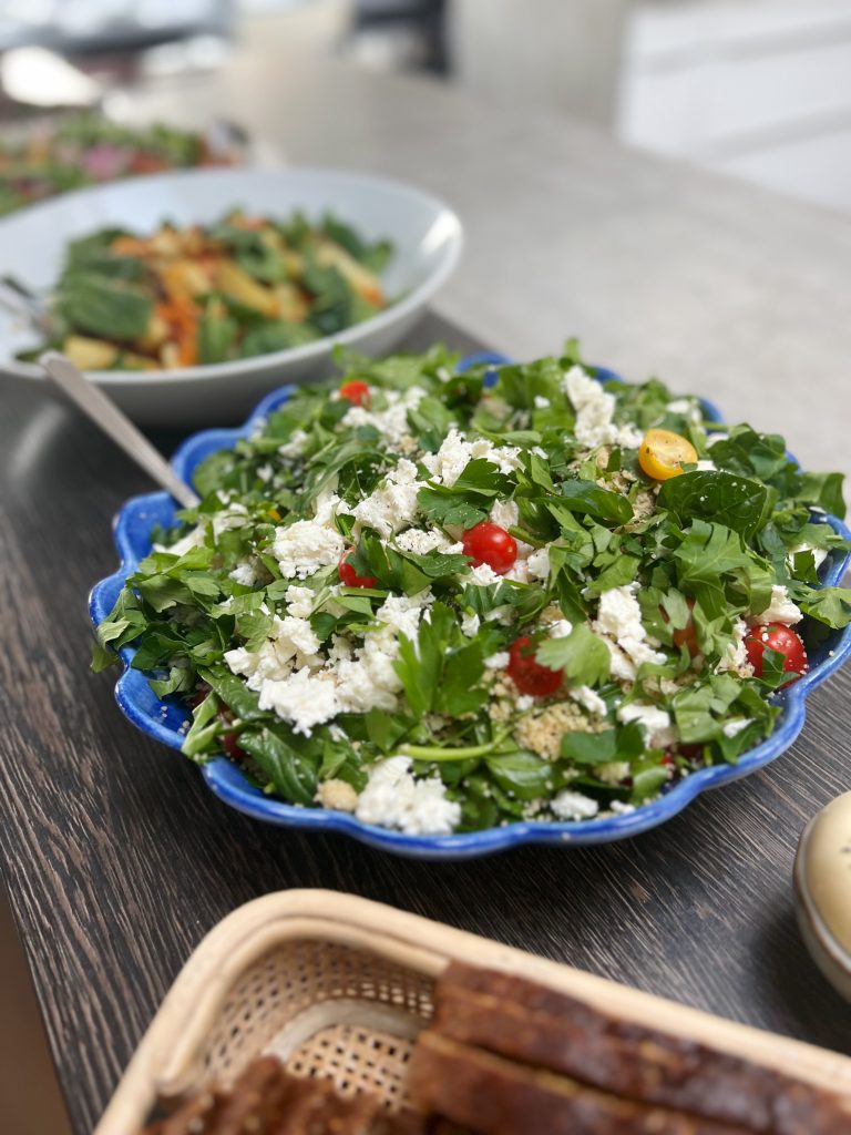 Till detta en sallad med couscous och feta, ett fat med rostade rotfrukter (sötpotatis, palsternacka och potatis), Hildas filmjölksbröd och en kall sås med västerbottenost och vitlök
